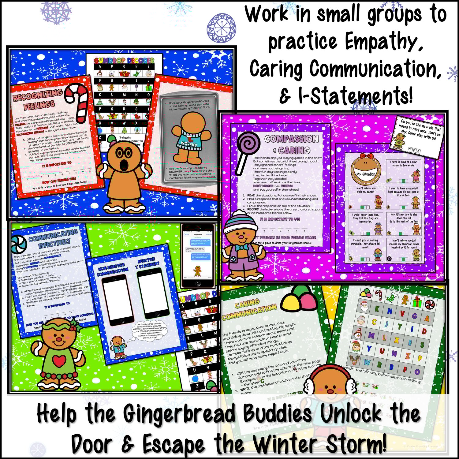 Help the gingerbread buddies learn the essential components to being kind through 5 different puzzles. Use the Gumdrop Decoder to solve puzzles about recognizing feelings and using “I” Statements. Sort situations and choose empathetic responses. Use the Gumdrop Grid to decode a tool useful for caring communication.