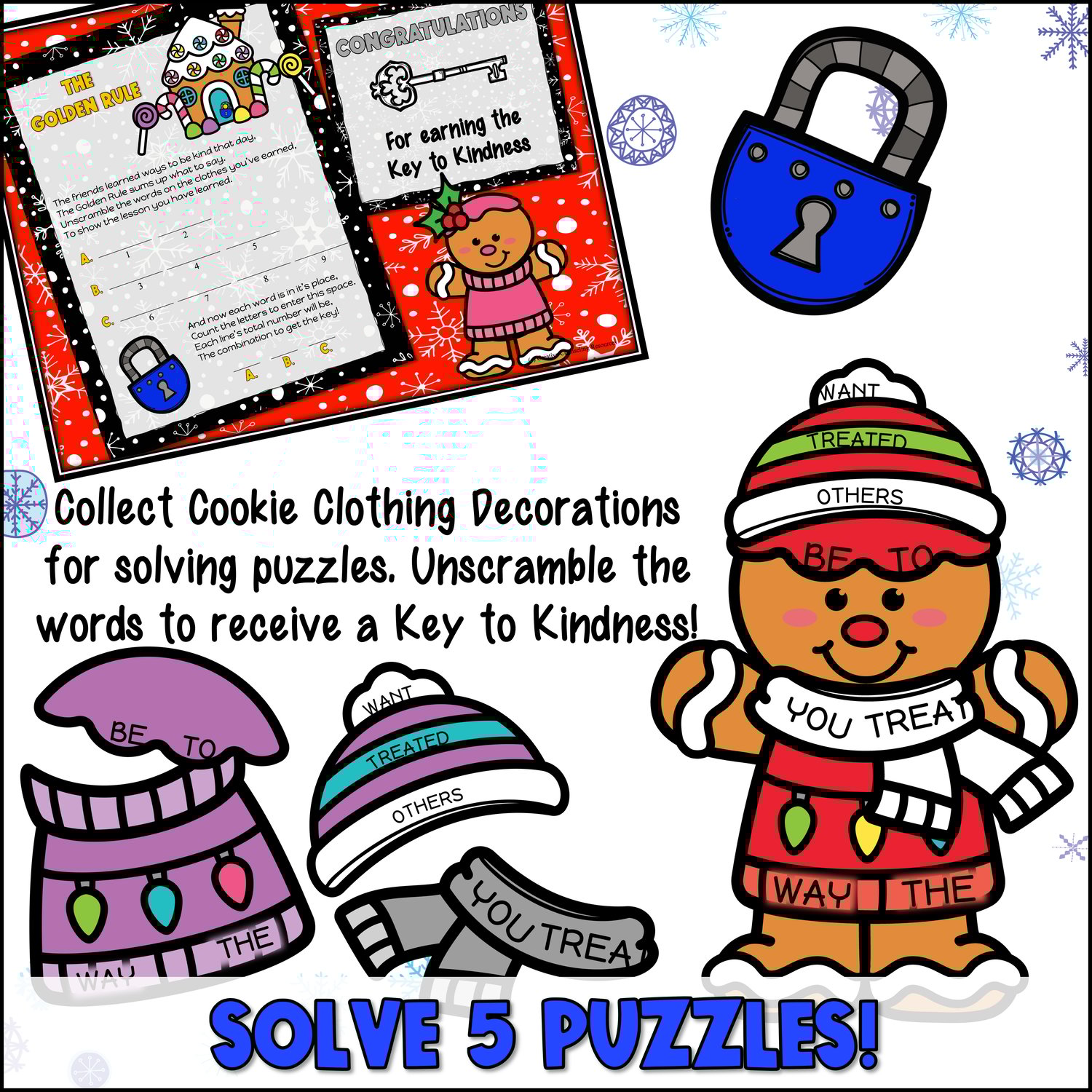 As each puzzle is solved, the group earns a piece of Cookie Clothing while learning a valuable lesson. Once the group gingerbread cookie is fully dressed, students earn the Key to Kindness Completion Certificate, along with Kindness bookmarks and bracelets, and can create their own Kindness Calendar!