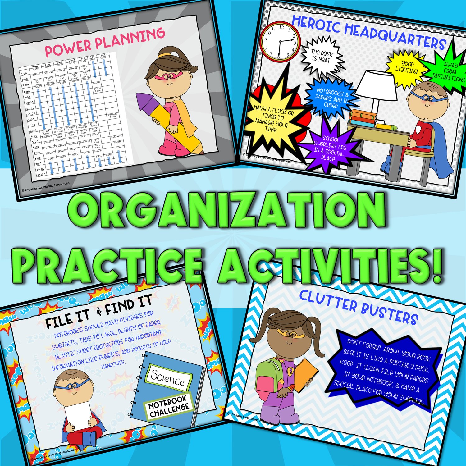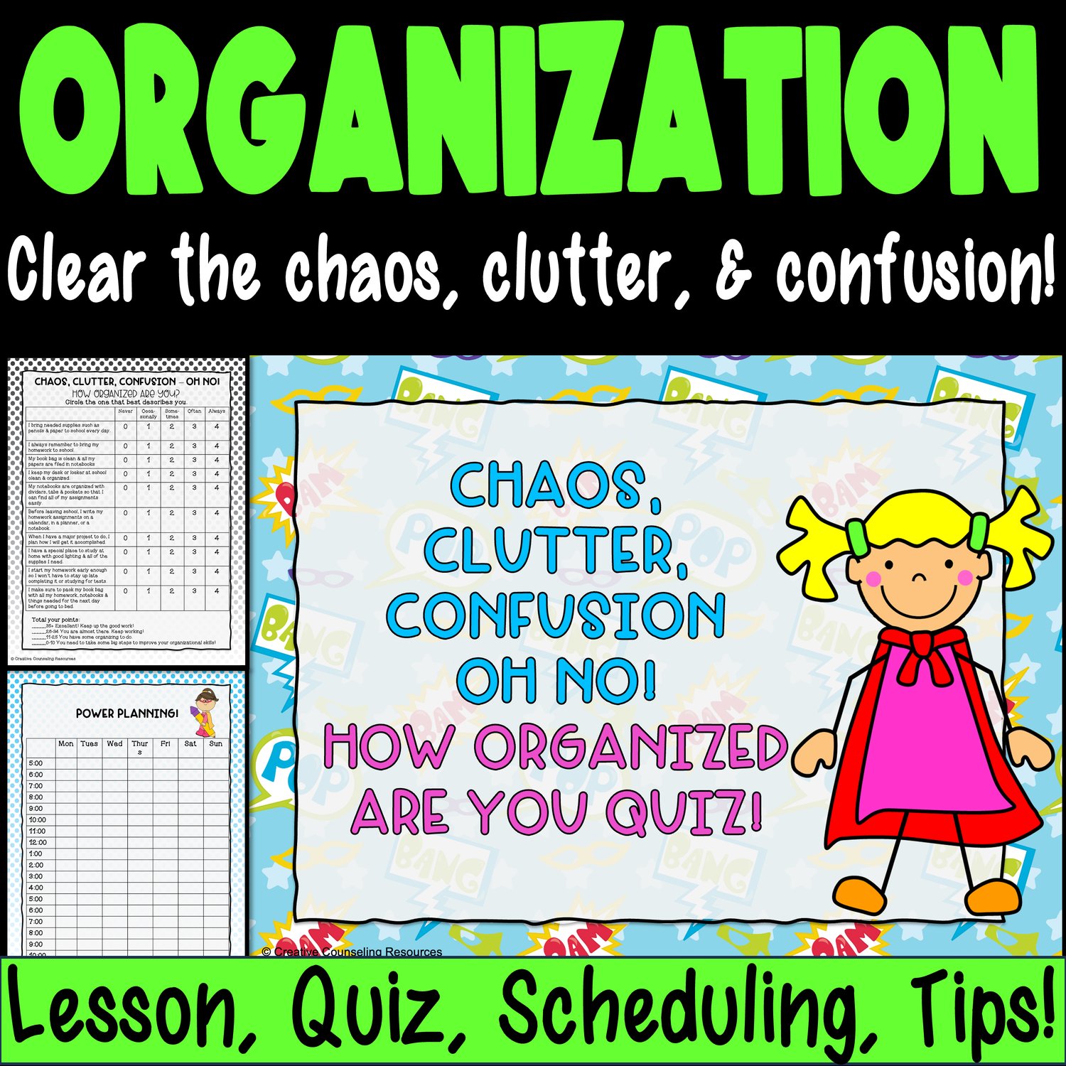 Kick things off with the “Chaos, Clutter, Confusion – Oh No!” Quiz to assess your students’ current organizational habits. Then, guide them through creating a personalized “Power Planning Schedule” to improve time management. Students will participate in the hands-on “File It & Find It Challenge,” designed to teach practical organization strategies. Finish with the “Organized Superhero Poster” to keep motivation soaring!