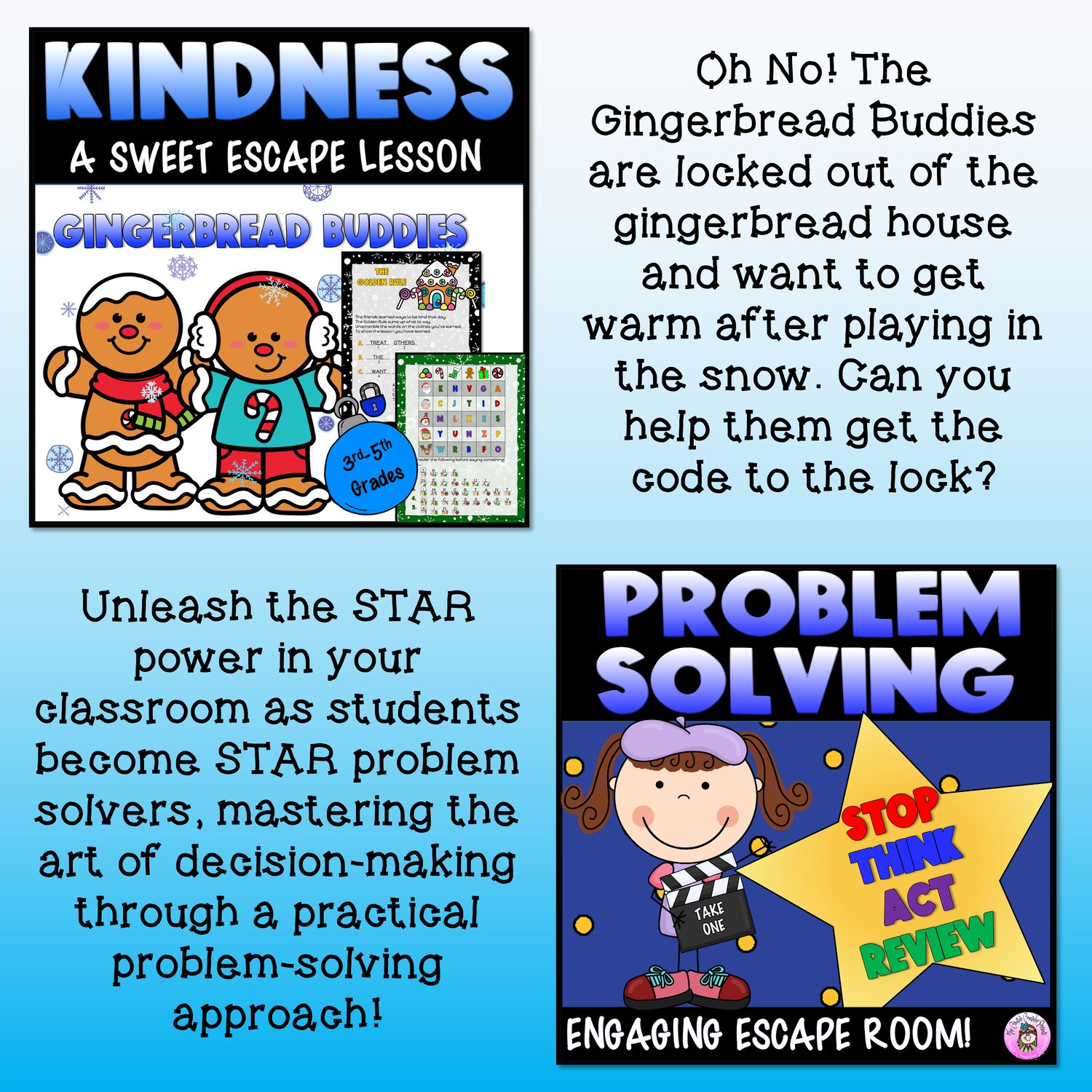 - Gingerbread Buddies Learn Kindness: Students learn empathy and conflict resolution in this sweet, holiday-themed escape.