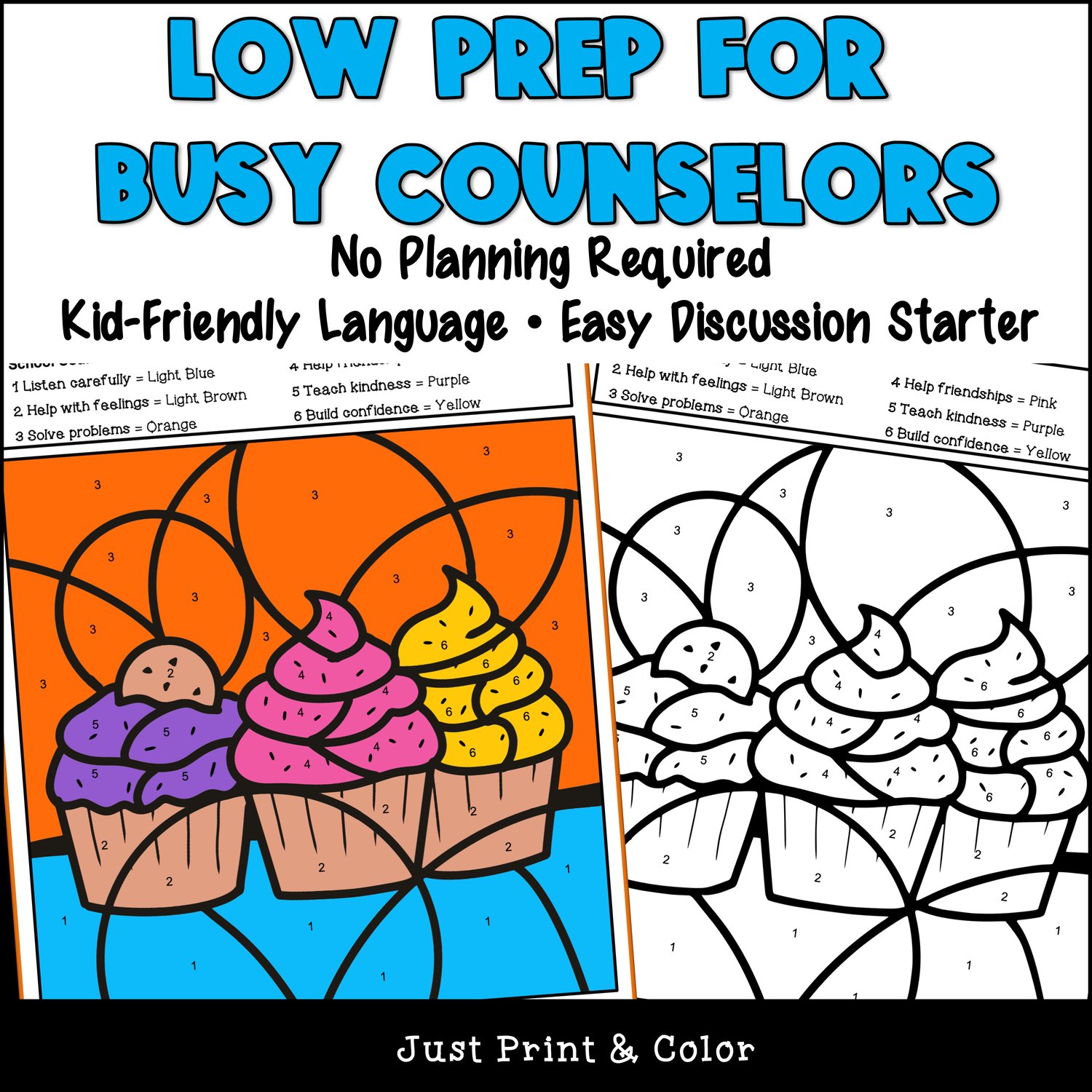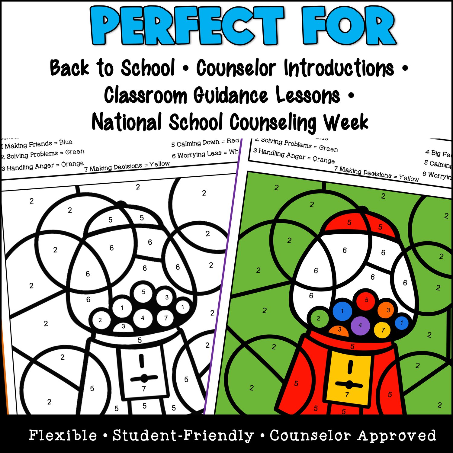 This resource includes 5 student-friendly Color by Code worksheets that explain what a school counselor does using familiar, comforting analogies like a gumball machine, cupcake, and heart. Students color while learning about feelings, problem-solving, and asking for help. The activities naturally spark discussion and help students feel safe and supported at school. Everything is designed with primary learners in mind.