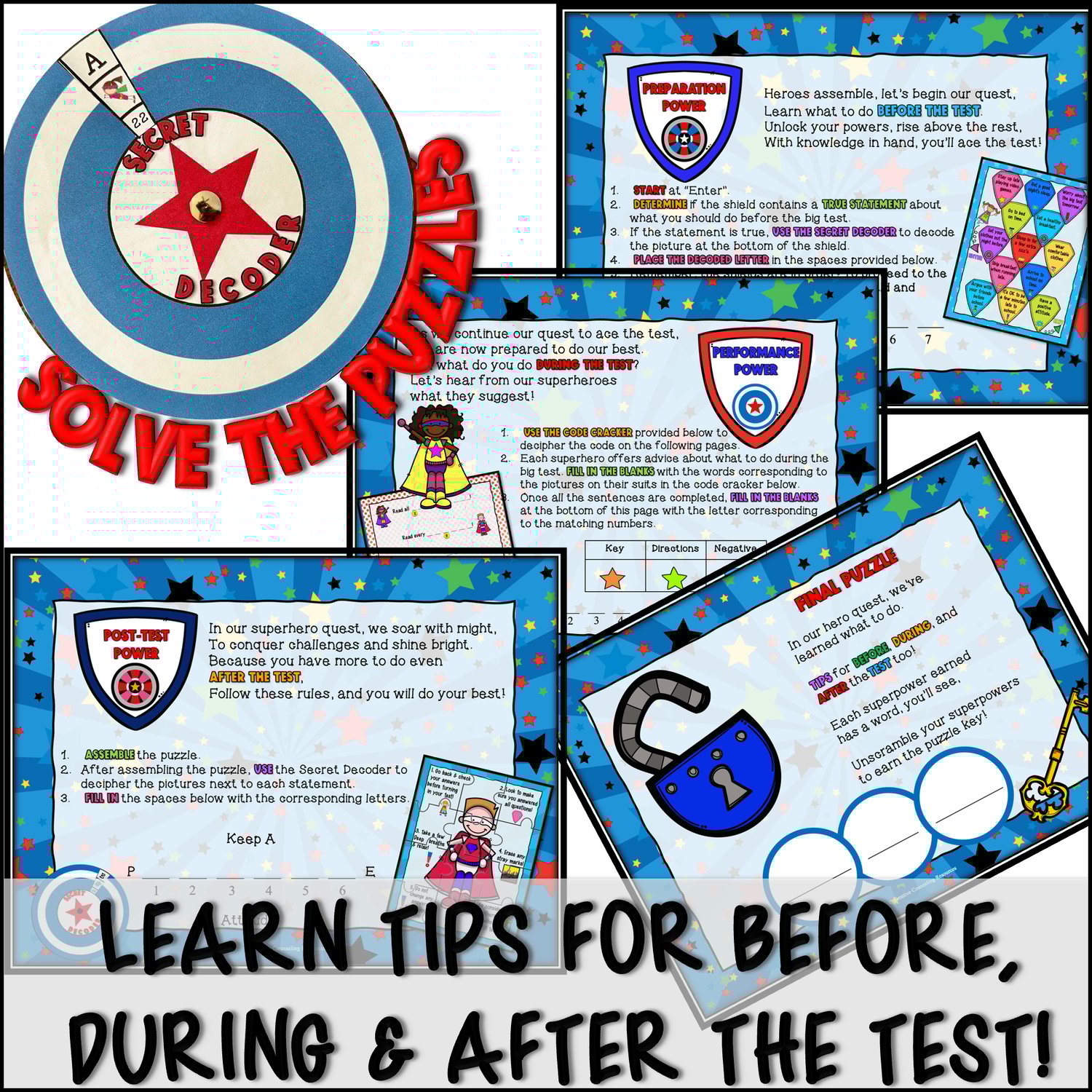 But the journey does not end there, young heroes. In the Chamber of Post-Test Power, you will assemble a Superhero puzzle of reflection and decipher codes with each statement for what to do AFTER the test. Uncover the secrets of reviewing your test before turning it in and earn the Post-Test Power to emerge stronger from every trial.