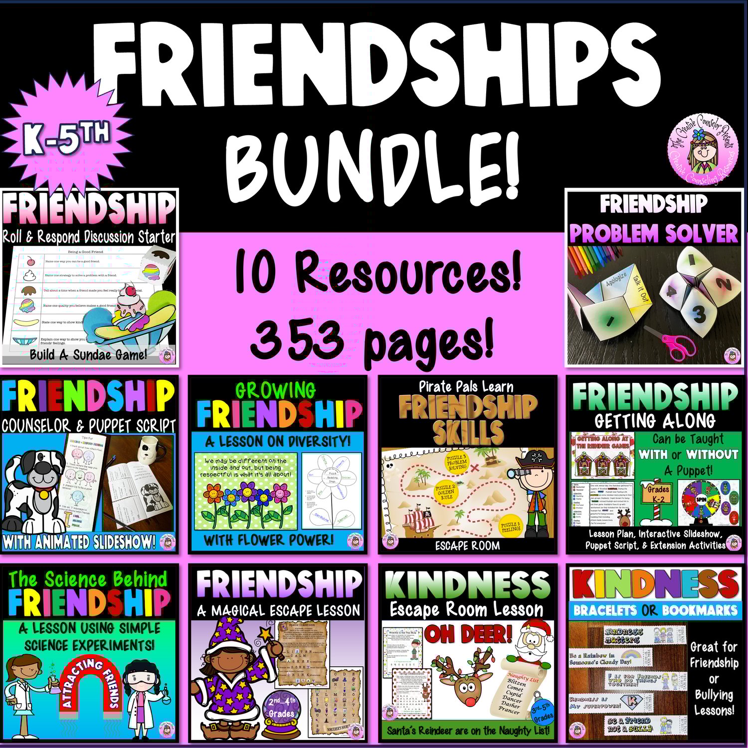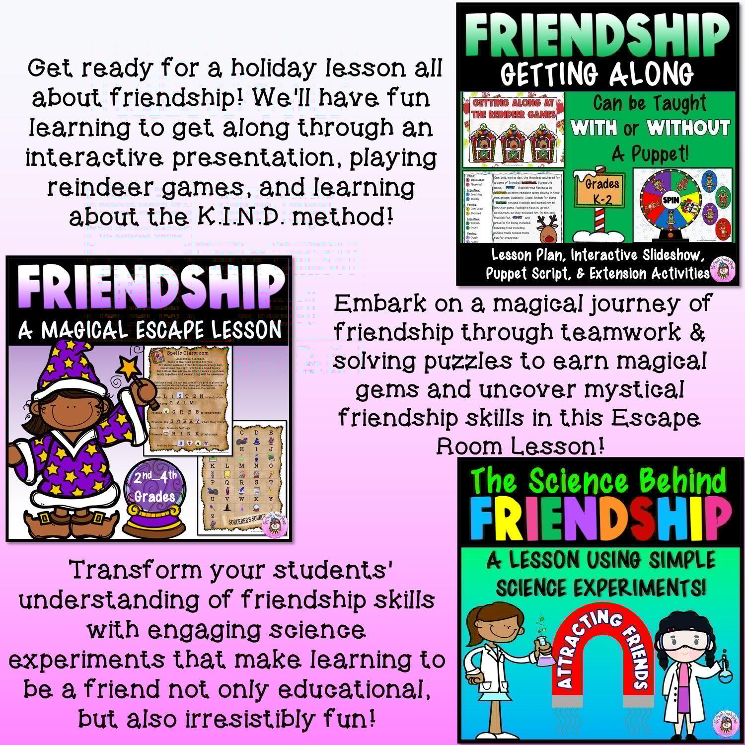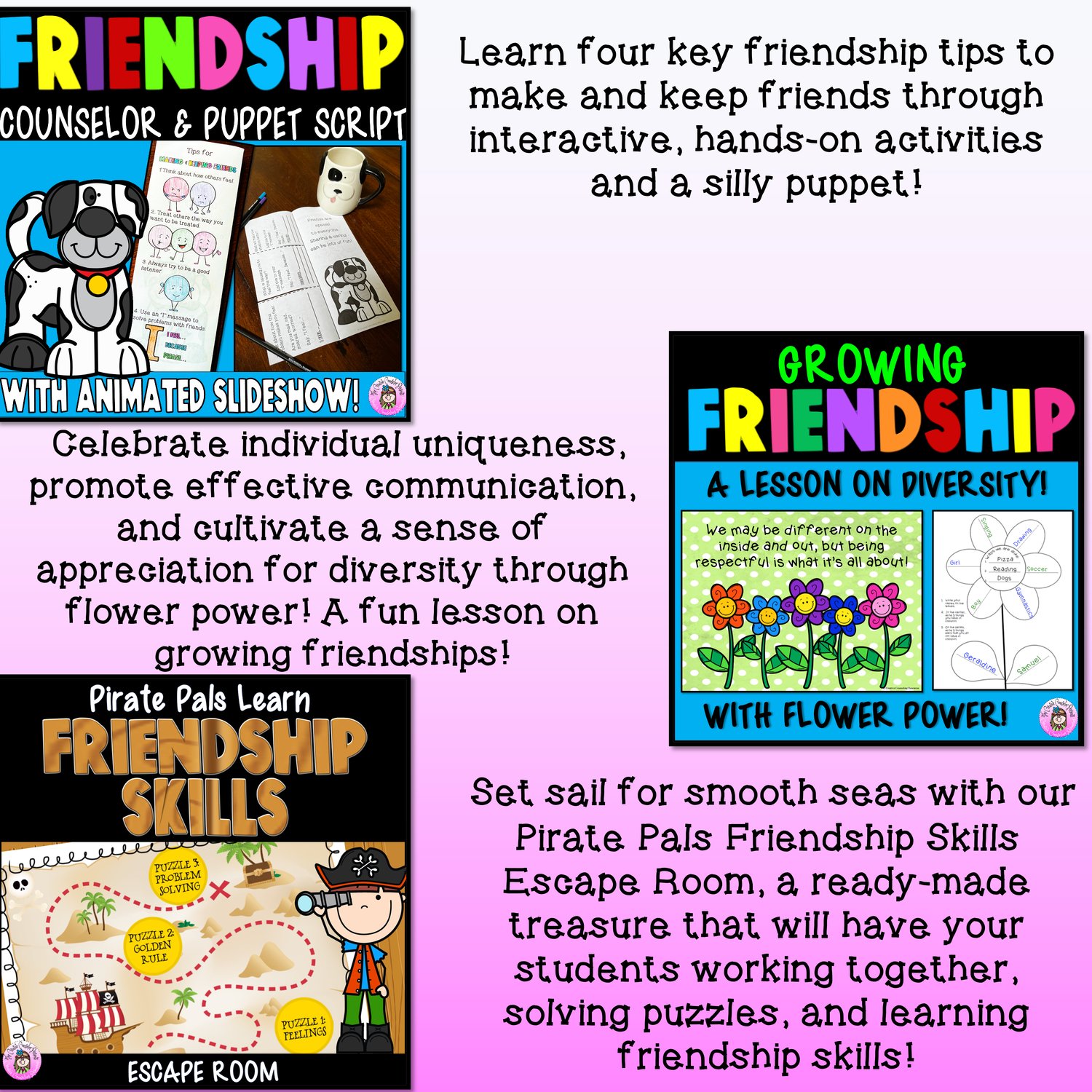 This bundle includes a variety of ready-to-use lessons and activities. From puppet scripts and animated slideshows to escape rooms and hands-on experiments, each lesson is designed to captivate your students. Activities include learning friendship tips with puppets, celebrating diversity, solving puzzles, and even conducting simple science experiments to understand friendship.