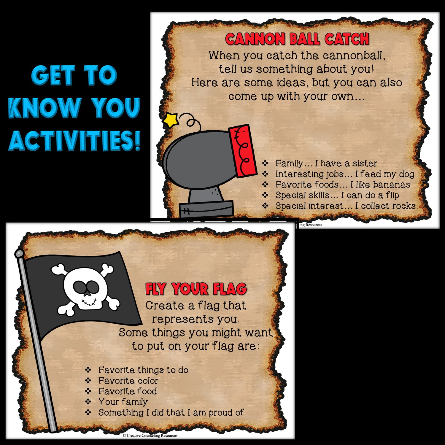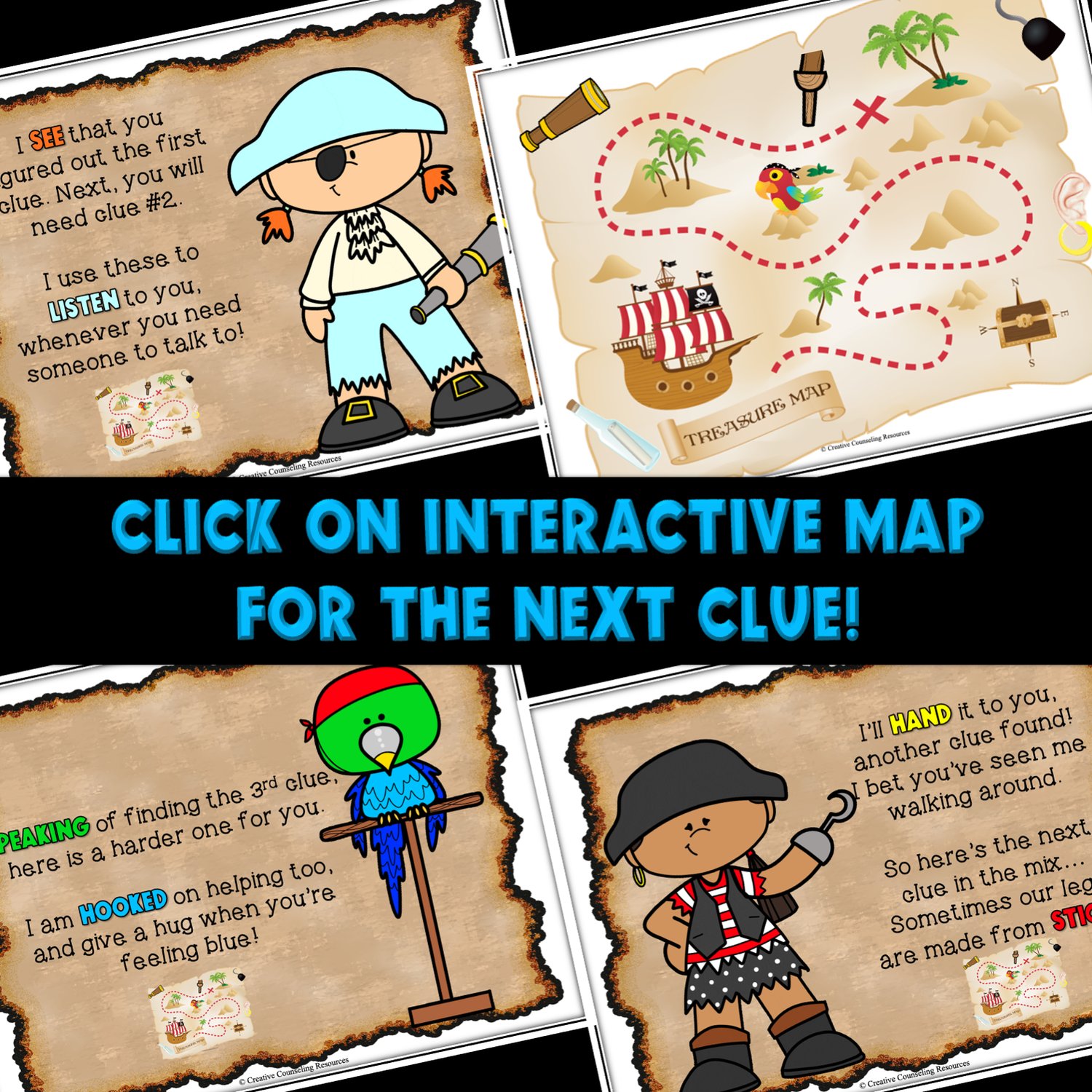 Yer mateys will be solvin' clever riddles like "I am 'hooked' on helping too and give a hug when you’re feeling blue" to uncover the next clue on the interactive map. They'll be blown away by the lively animated pirate pictures on every slide! The real treasure? Arrr, ye be the true treasure, me hearty School Social Worker! Let's finish with a "Catch the Cannon Ball" get-to-know-ye game and a flag-making activity to hoist our spirits high!