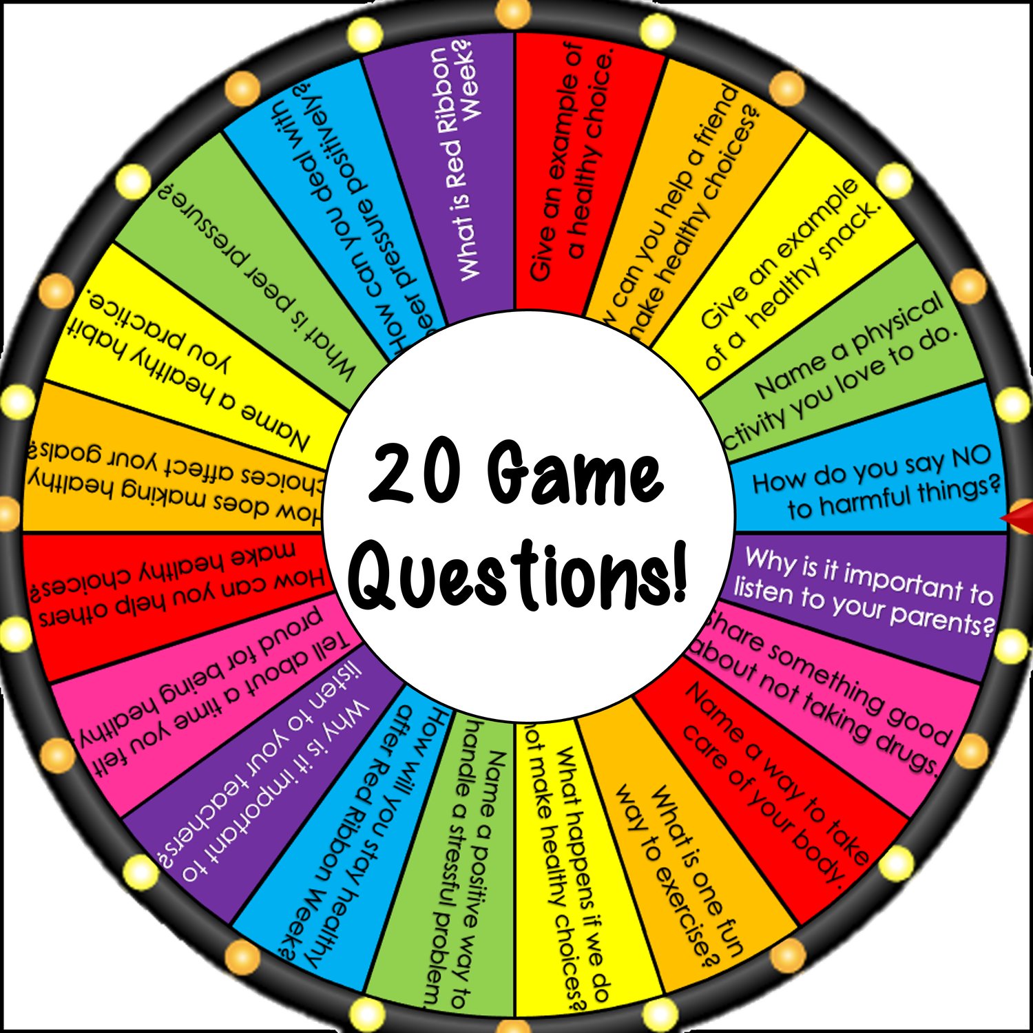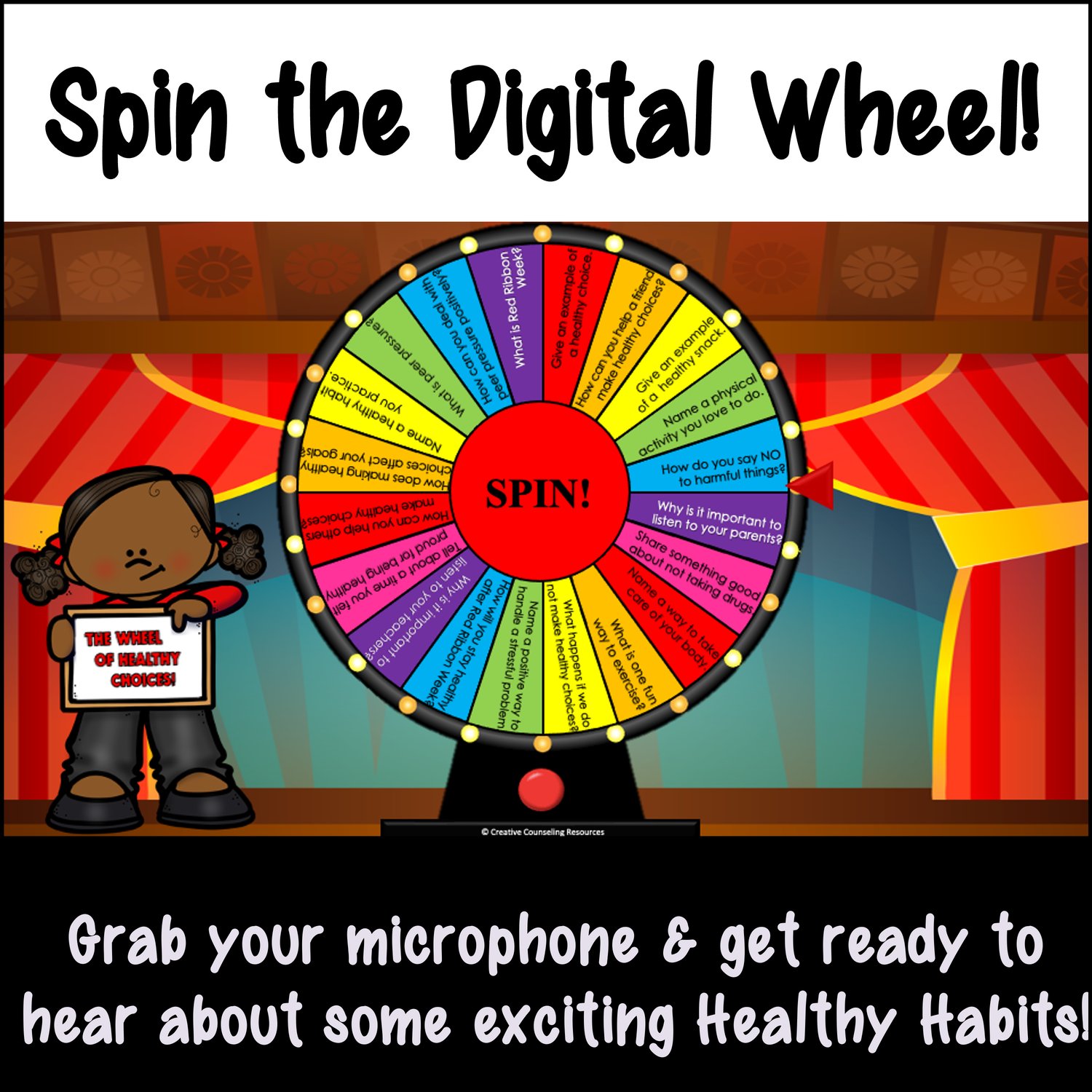 Students Spin the Wheel: We've got a colorful digital spinner that'll add a dash of suspense and anticipation. With every spin, students discover which question they'll face. The wheel has 20 questions ranging from healthy habits to handling peer pressure.