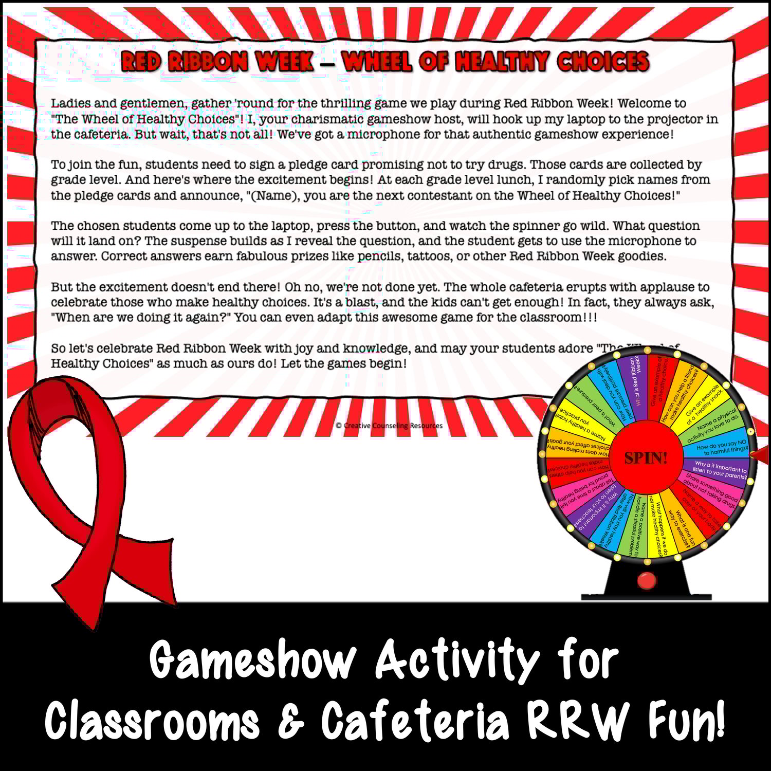 Are you looking for a Red Ribbon Week Activity that takes little setup but makes a HUGE impact? Introducing the Wheel of Healthy Choices! This animated, spinning wheel and engaging game will have your students hooked, cheering, and learning all at once!