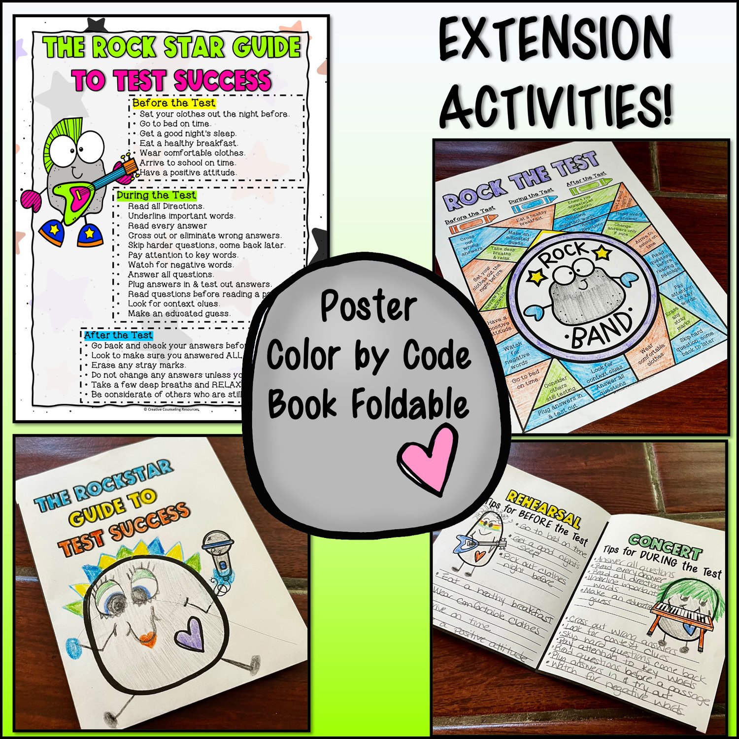 If all of this fun was not enough, continue the rocking experience with an optional extension activity: The Rock Star Guide to Test Success Foldable Book. Complete this activity by adding details to make your own rock star band, color, and add testing tips to each page.
