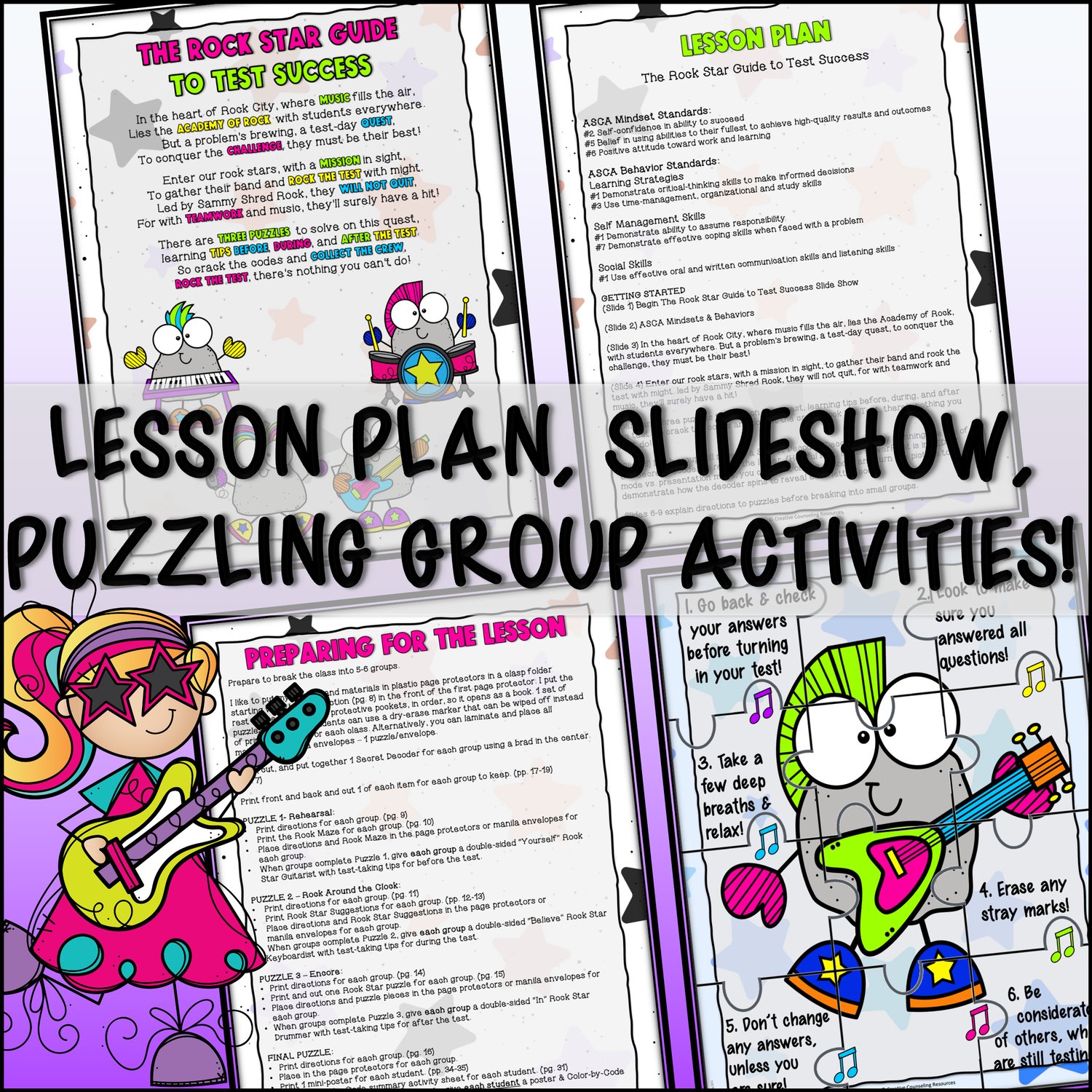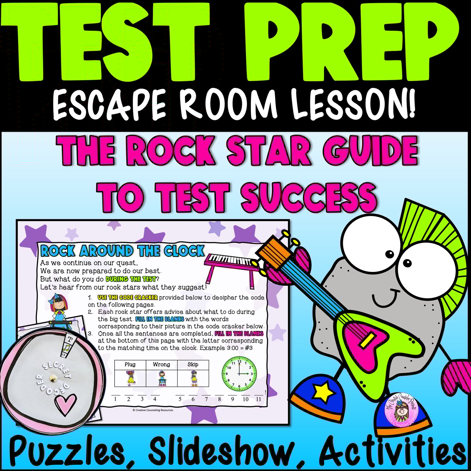 Welcome, Rock Stars! Sammy Shred Rock needs your help. He needs to get the band together to Rock the Test! You will need to decipher clues, unlock gnarly puzzles, and collect the crew in a ROCKING ESCAPE ROOM LESSON. Learn lessons on test preparation, effective test-taking strategies, and post-test reflections. Unlock invaluable test-taking skills along the way!