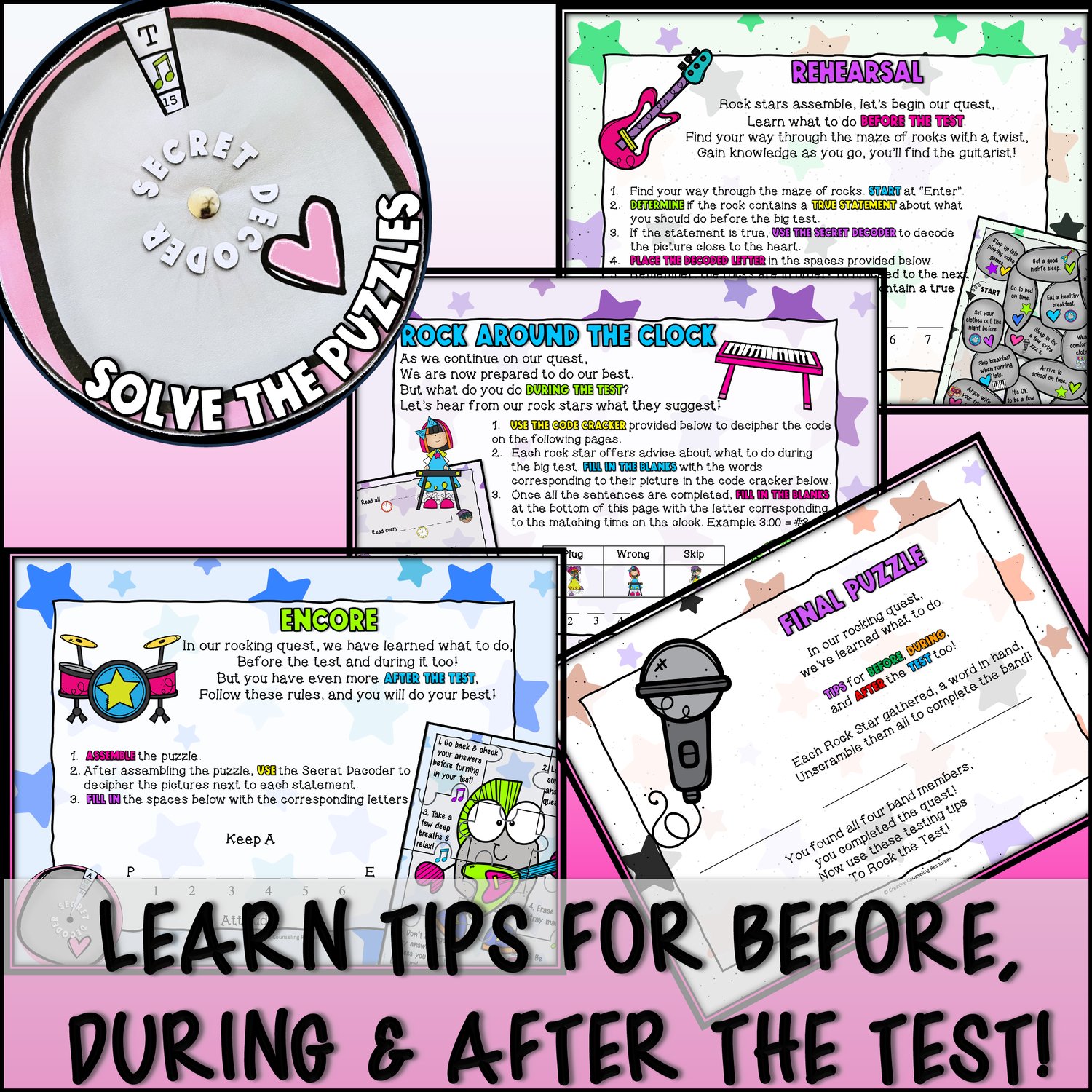 Next, your quest is to Rock Around the Clock! Use the Code Cracker to decode the Rock Stars' Suggestions and fill in the blanks with the missing words, unlocking the secrets of what to do DURING the test.