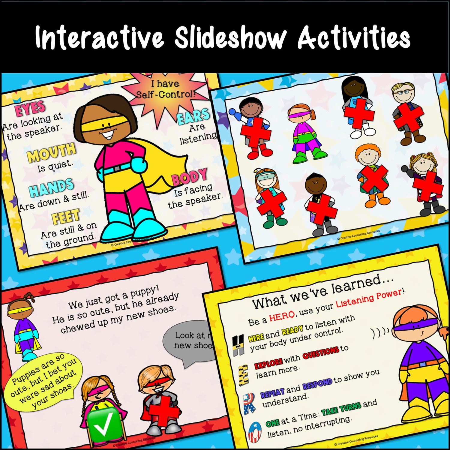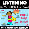 ⭐️ Want to help your students develop better listening skills? Help your students improve their communication skills with others through active listening. This highly engaging puppet script, lesson plan, and animated slideshow will have your students giggling all while learning through play four tips to having sensational listening superpowers!