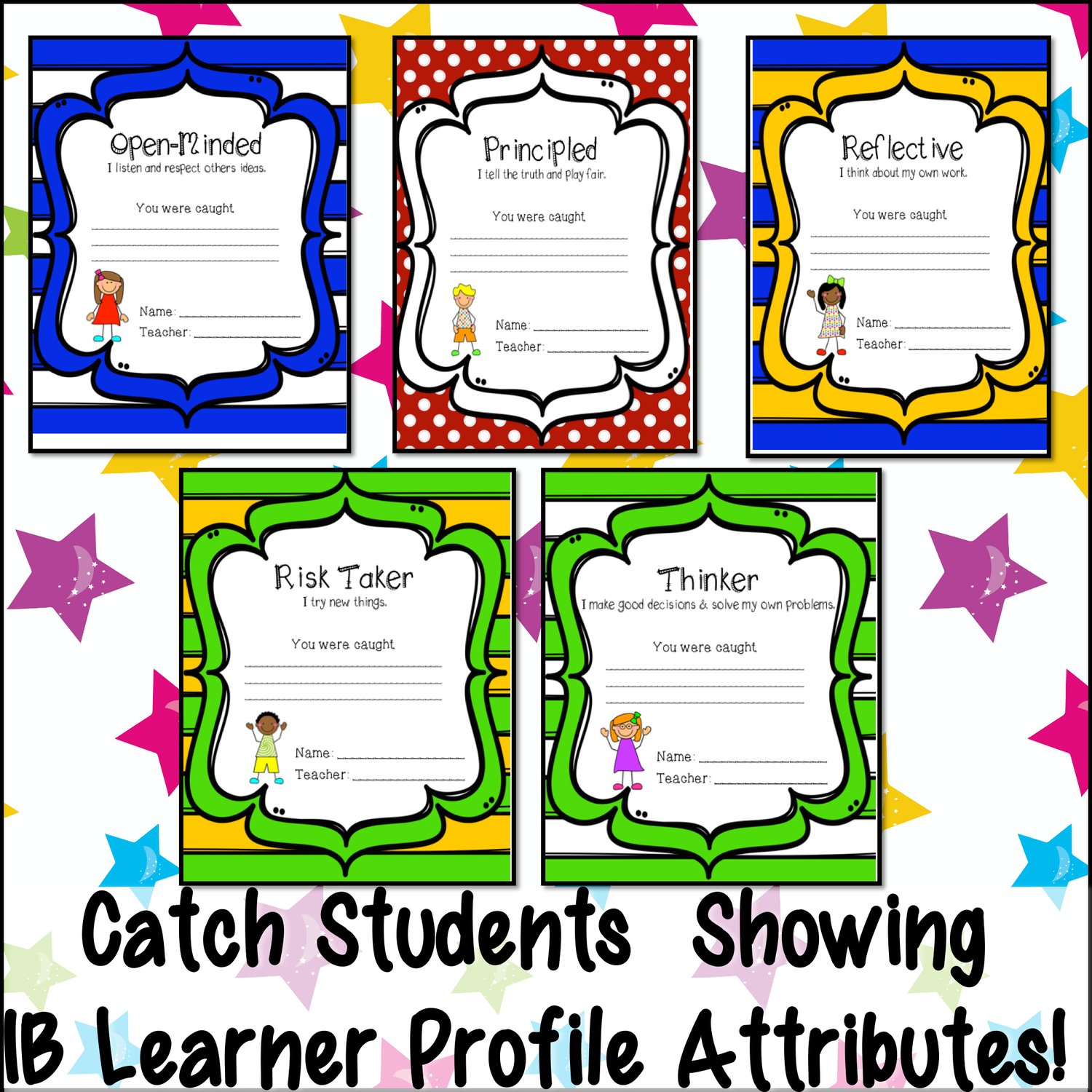 Your fantastic set includes four different Caught Cards for each of the IB Learner Profile Attributes. From being Balanced and Caring to being a Communicator, Inquirer, Knowledgeable, Open Minded, Principled, Reflective, Risk Taker, or Thinker, these cards cover it all!