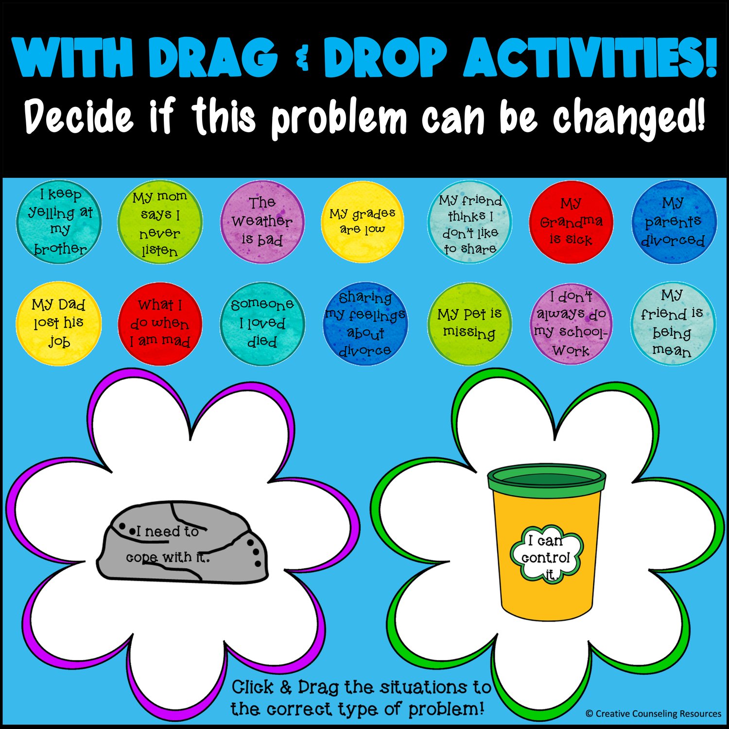 The lesson itself is interactive and self-directed. Its main goal is to help students identify two types of problems - play dough problems (ones you can change) and rock problems (ones you have to cope with). To make it more engaging, students get to practice dragging and dropping different situations onto the play dough tub or the rock.