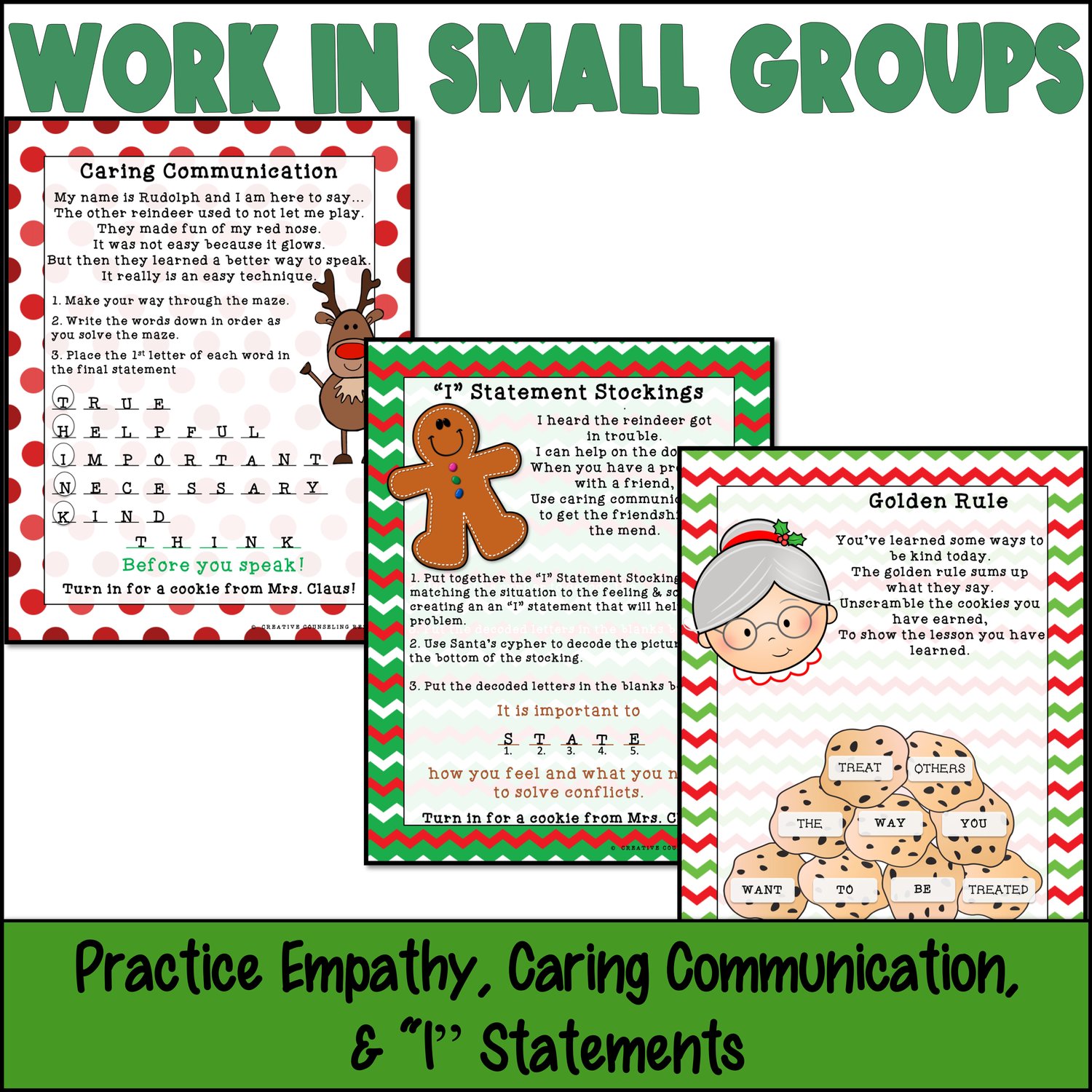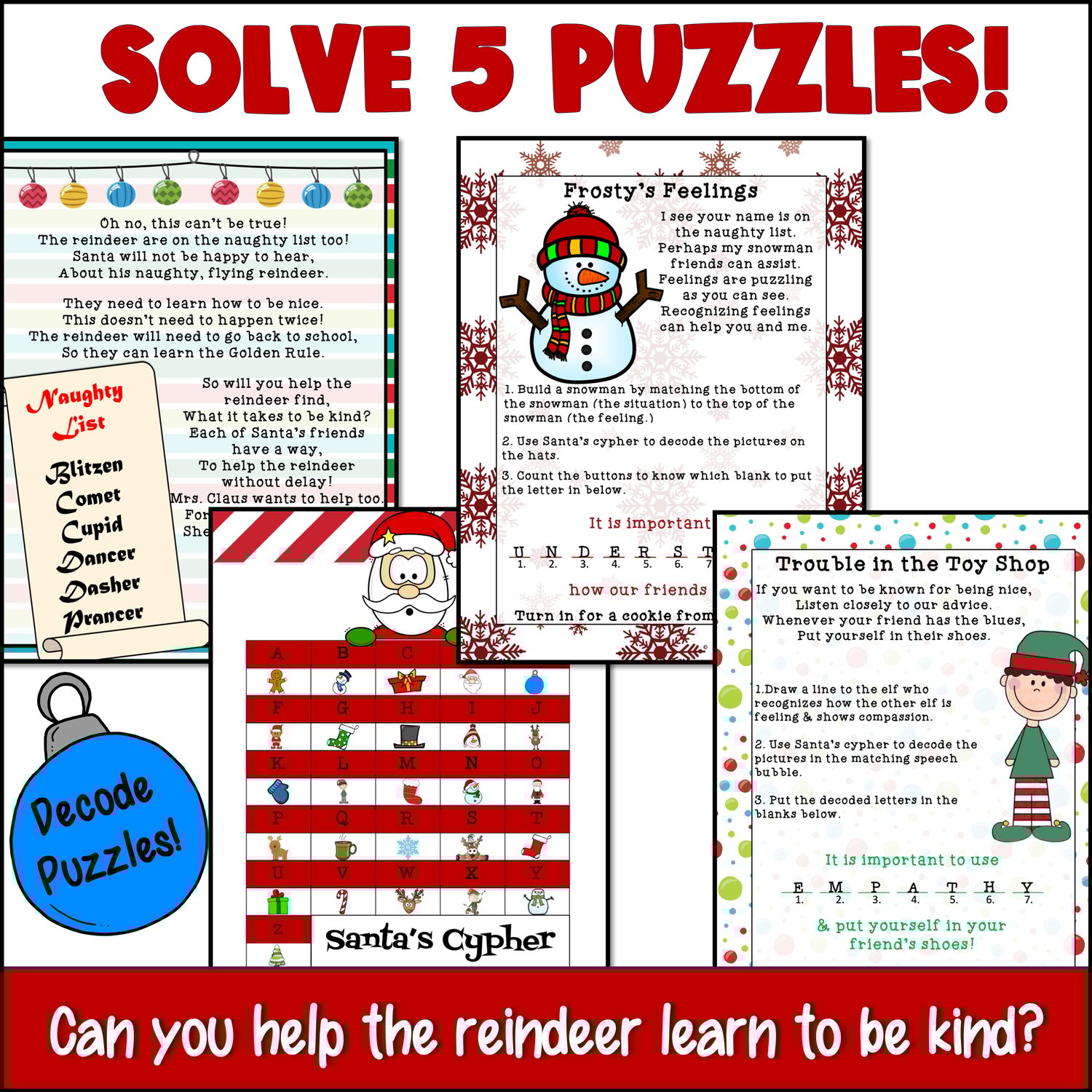 5 different puzzles, and practice the essential components to being kind. The reindeer meet Santa's friends along the way who want to help them learn how to recognize feelings, learn how to make "I" Messages, be empathetic, and use caring communication. In this Escape Room style lesson, teams will receive cookies from Mrs. Claus as they solve each puzzle.
