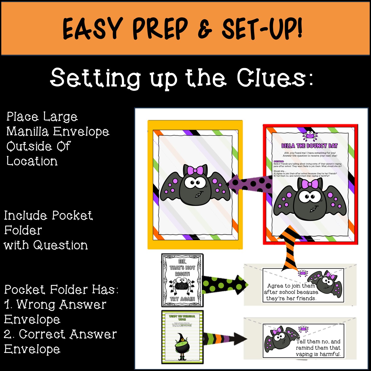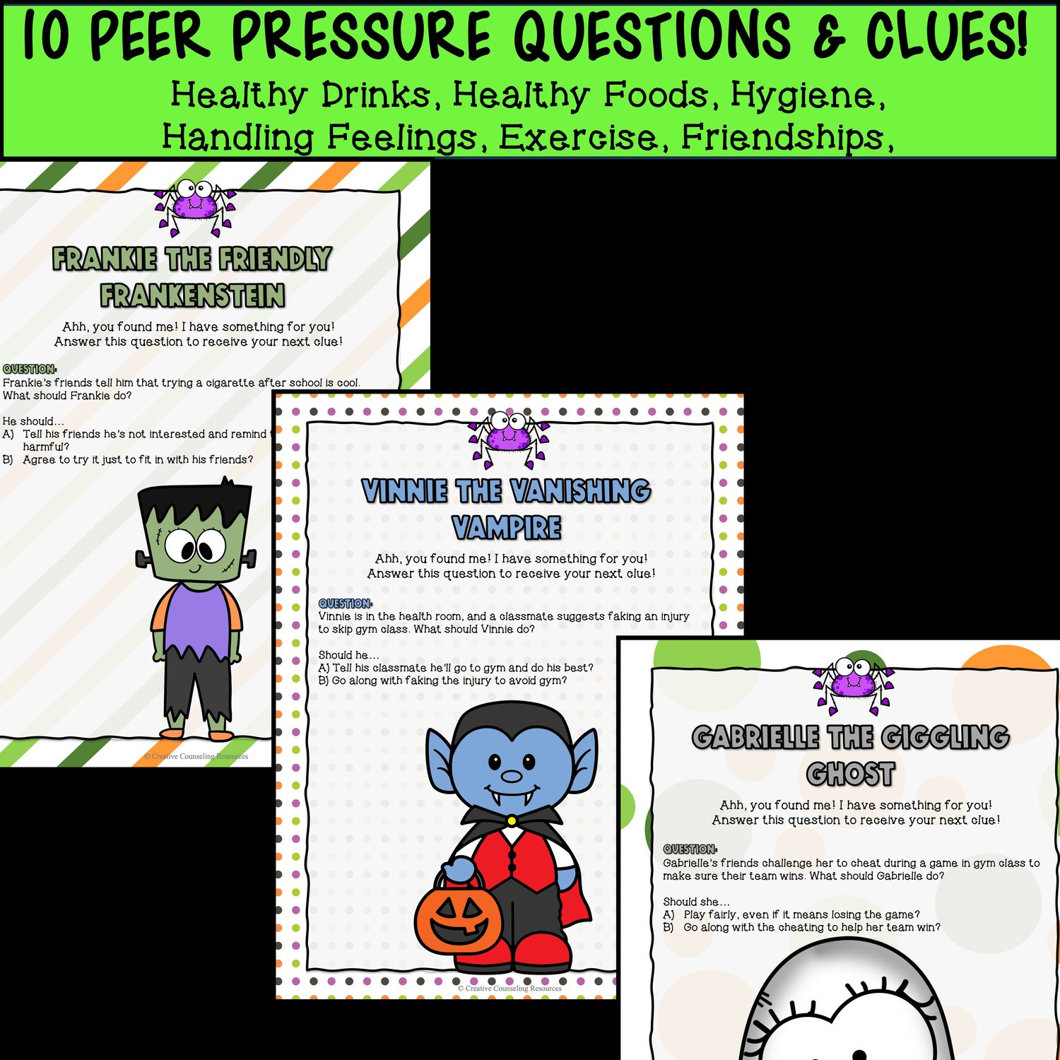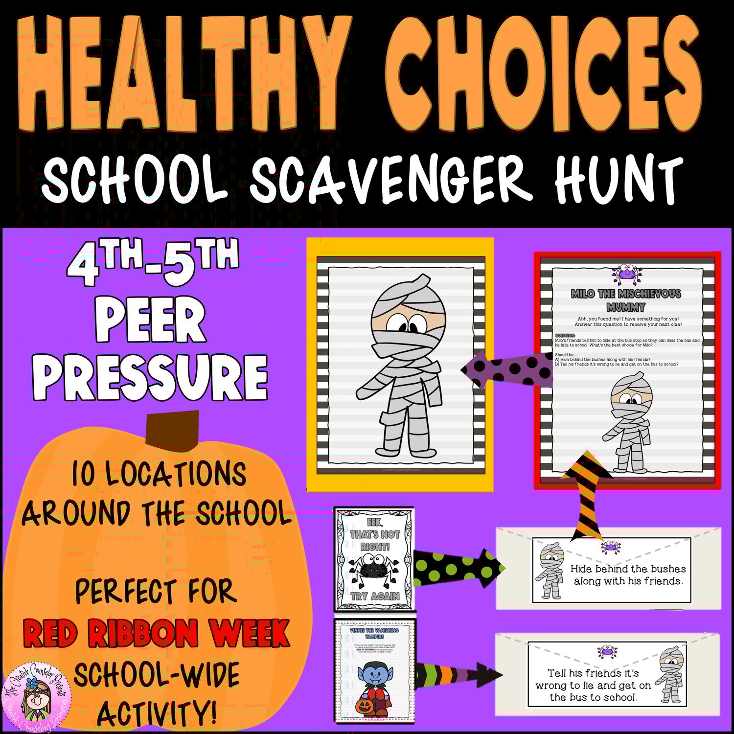 Help your 4th-5th graders navigate the tricky ways of peer pressure with this engaging, Halloween-themed scavenger hunt! Tailored to teach refusal skills and safe vs. unsafe choices, this scavenger hunt is perfect for Red Ribbon Week or any classroom lesson on peer pressure. Students will move around the school, solving clues and answering questions about how to make safe choices in peer pressure situations—all with the help of fun Halloween characters.