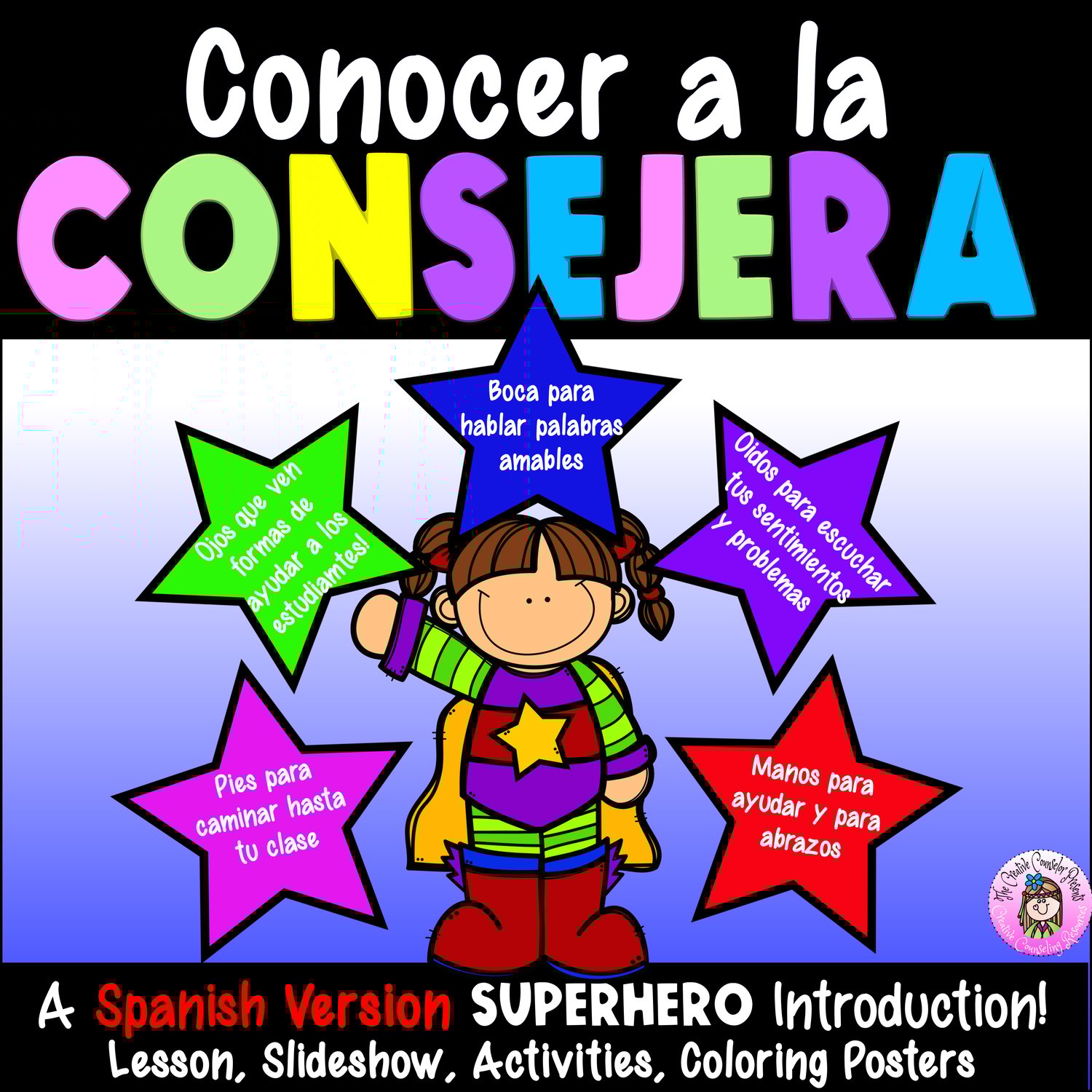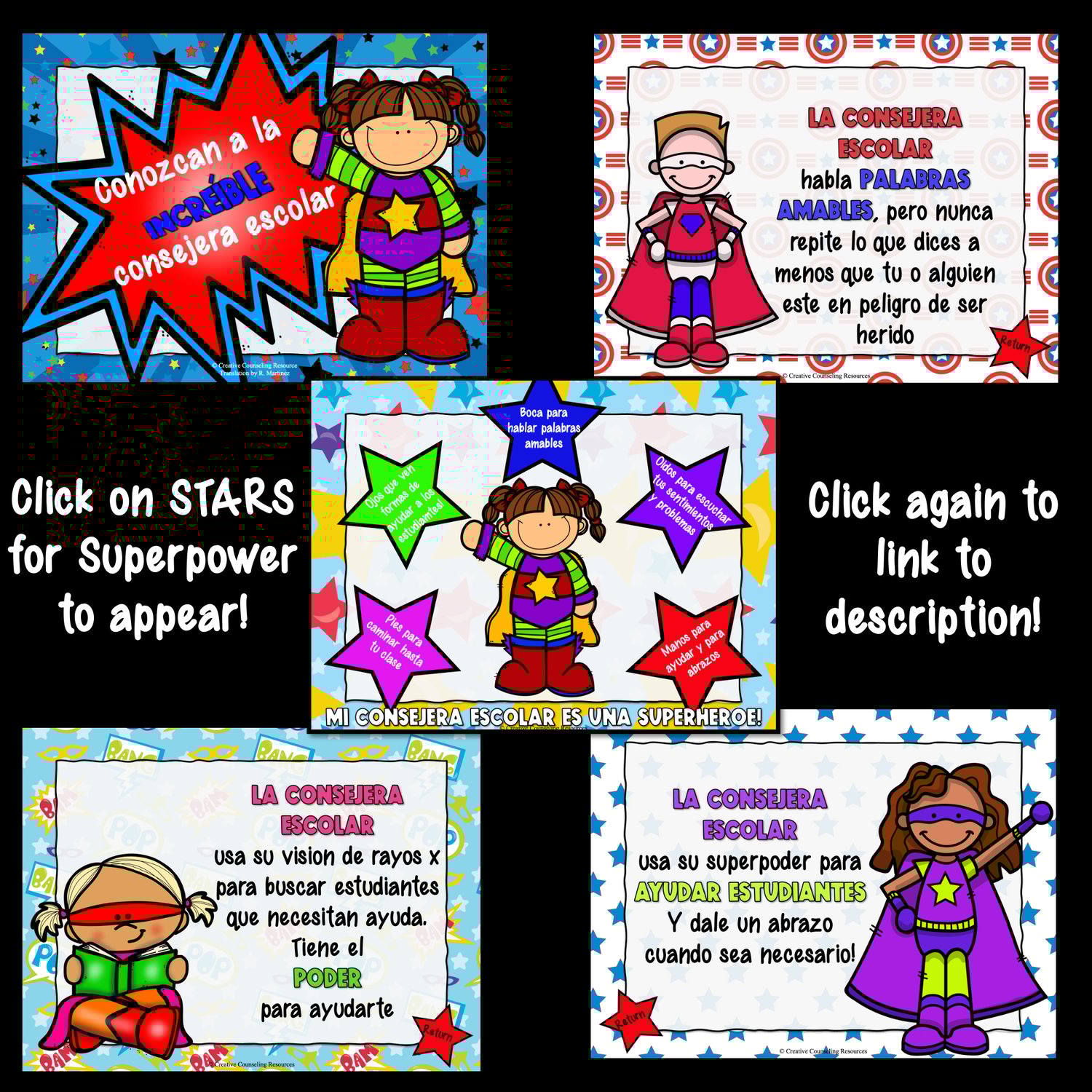 The lesson plan is written in English, and the slideshow and activities are translated into Spanish. The interactive slideshow allows you to click on the stars to reveal and learn about the counselor's superpowers. Each click provides a description of the superpower in Spanish.