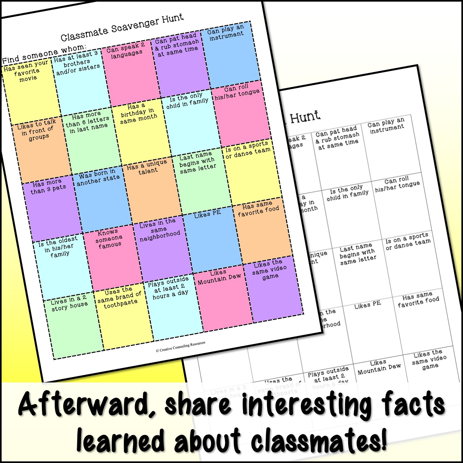 Offering small prizes for the first few completed hunts adds excitement and encourages participation. After the scavenger hunt, gather your students to share interesting facts they learned about each other, fostering a sense of belonging and connection.