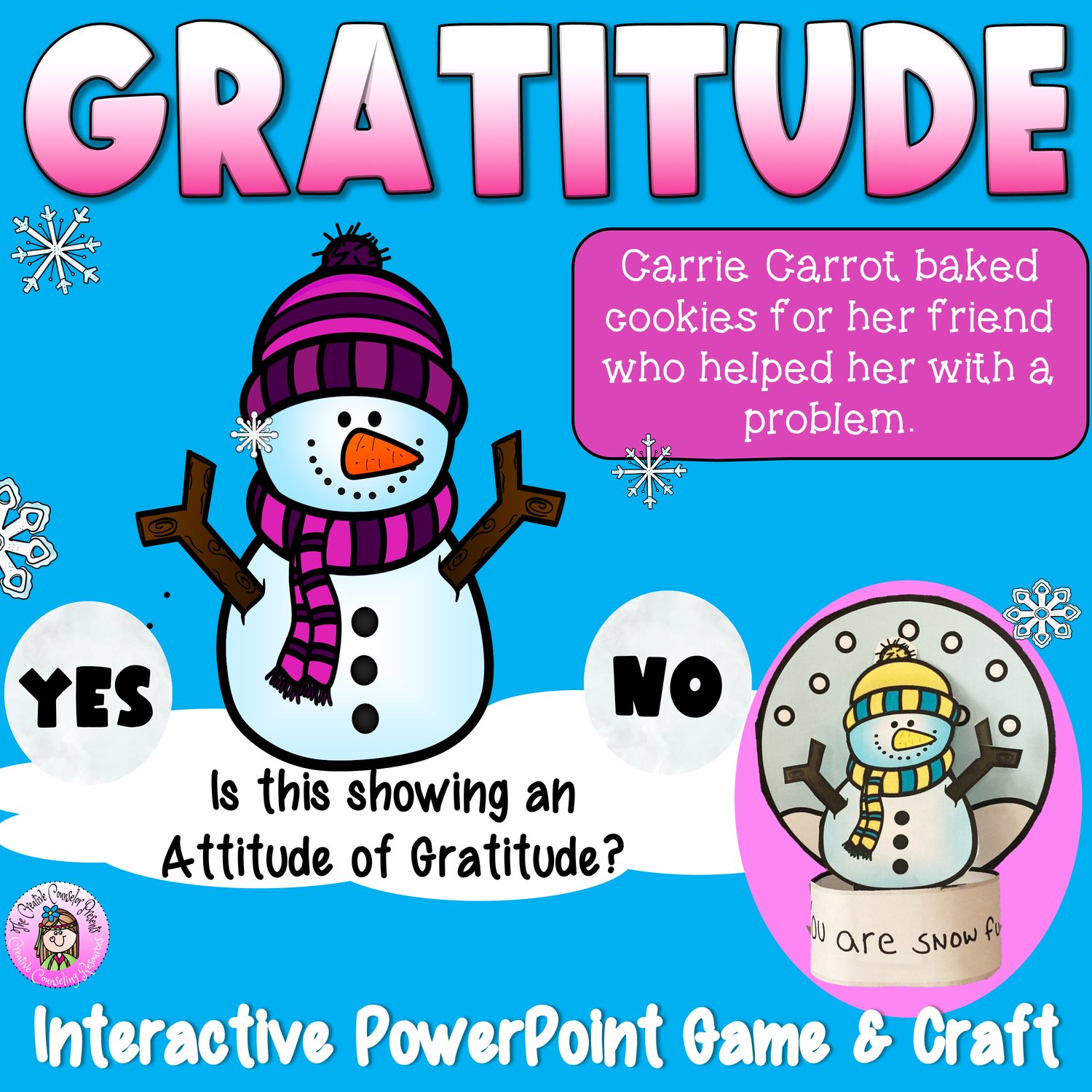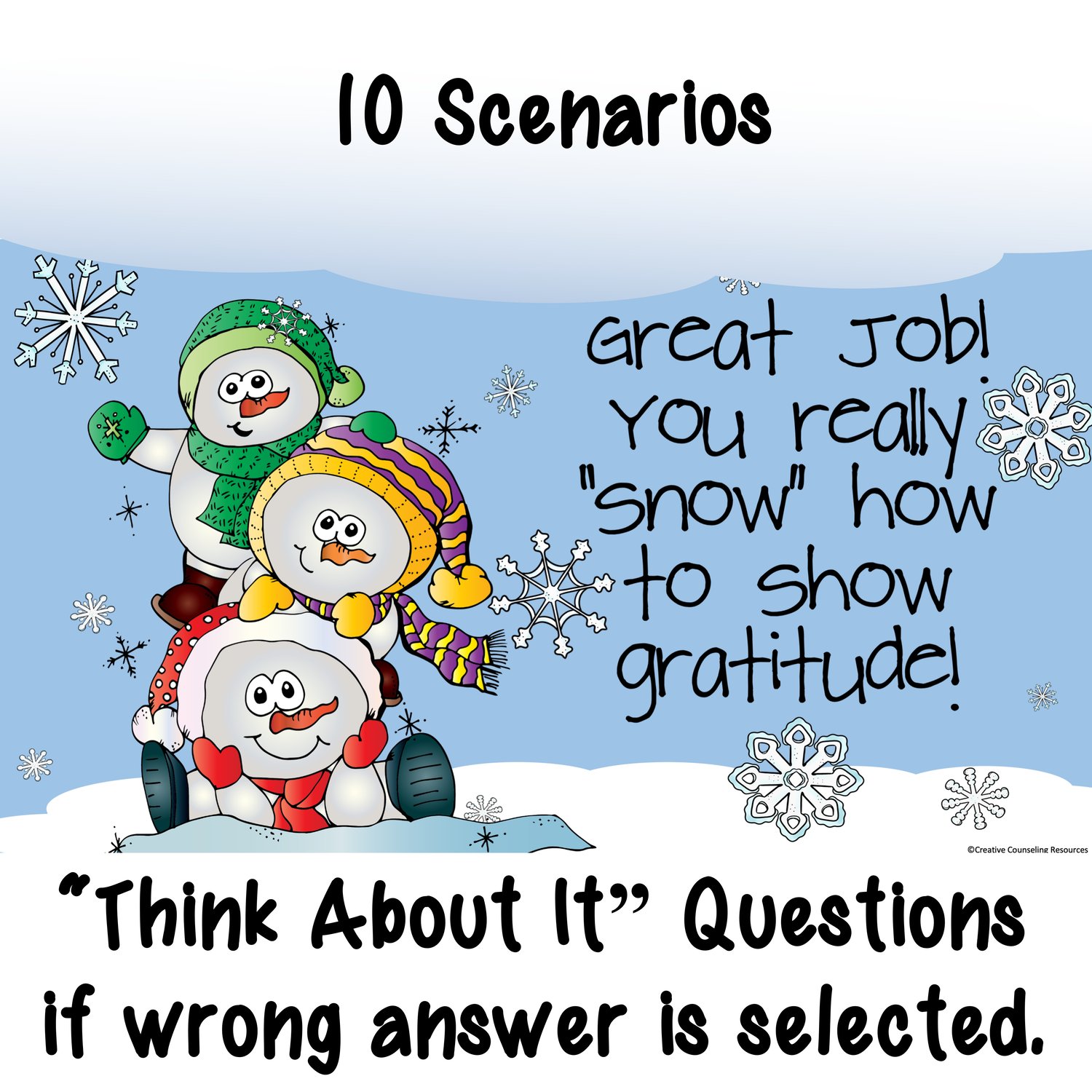 As an introduction to a lesson on gratitude or a fun culminating activity, this PowerPoint game empowers students to make decisions in scenarios presented. Additionally, this resource includes a 3-D Gratitude Snow Globe Craft, providing a hands-on and creative aspect to reinforce gratitude. Acting as the snowman in the game, students can further explore and apply their understanding of gratitude by creating tangible expressions of appreciation through the snow globe craft. The craft encourages them to write thankful messages, fostering a deeper understanding of gratitude's significance. A wrong answer prompts a "Think About it" question, encouraging reflection, while a correct answer reveals a positive note detailing the snowman's expression of gratitude. With 10 scenarios to explore and a hands-on craft to complement the learning, this resource amplifies the practice of gratitude skills in an engaging and interactive manner.