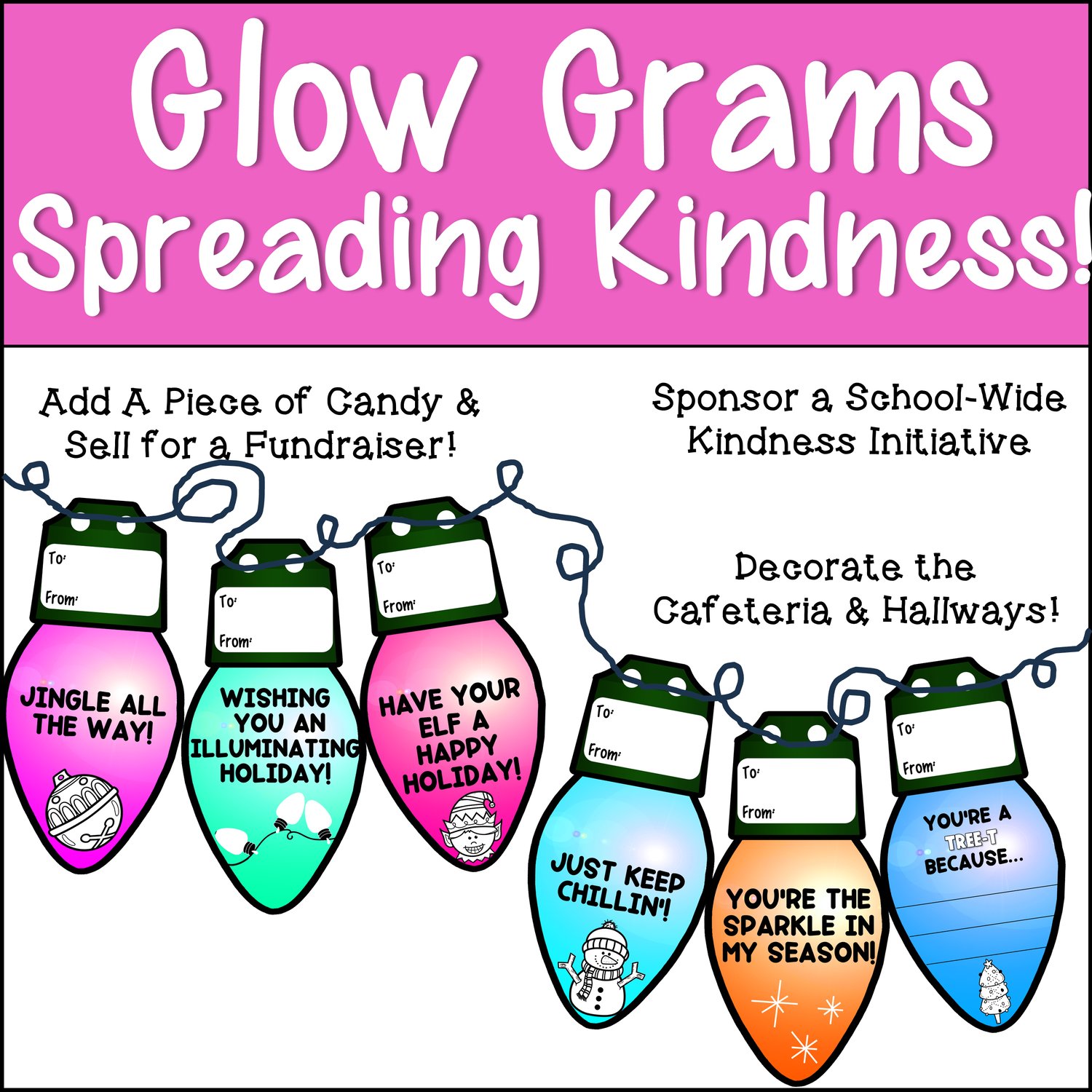 Glow Grams for K-5th: Spread joy and kindness with vibrant Winter and Christmas-themed Glow Grams! With 30 unique designs and blank templates for personalization, these heartwarming messages encourage compassion and camaraderie among students, teachers, and parents.
