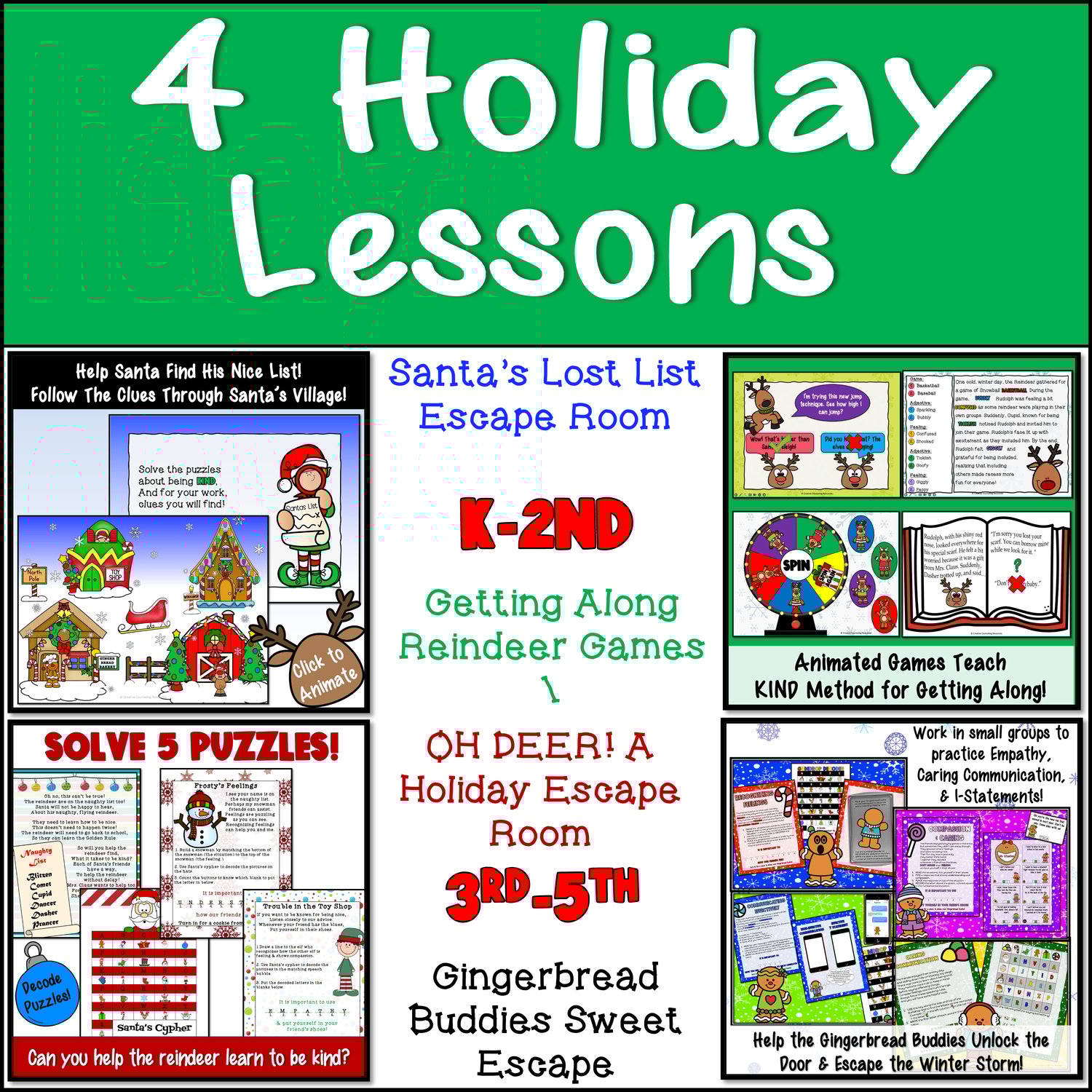 Oh Deer Escape Room (3rd-5th): Join Santa's Reindeer on a quest to escape Santa's Naughty List! Dive into five engaging puzzles focused on recognizing feelings, empathetic responses, and caring communication, fostering a culture of kindness and teamwork.