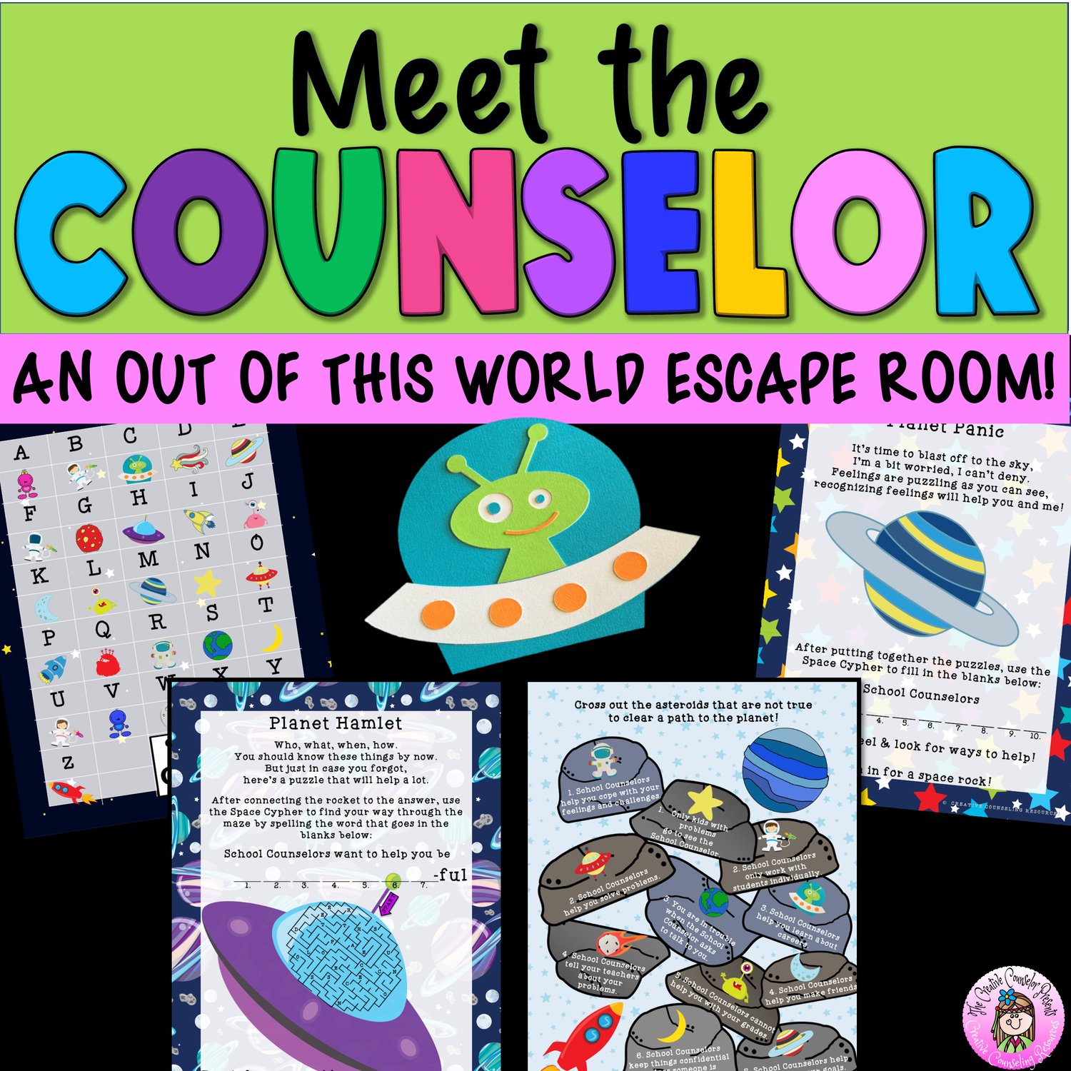 Embark on a galactic adventure with our Meet the School Counselor Introduction Escape Room lesson! Join forces with your fellow students to rescue your captured School Counselor from an extraterrestrial being. Solve puzzles across three planets and collect glowing space rocks to save the day!