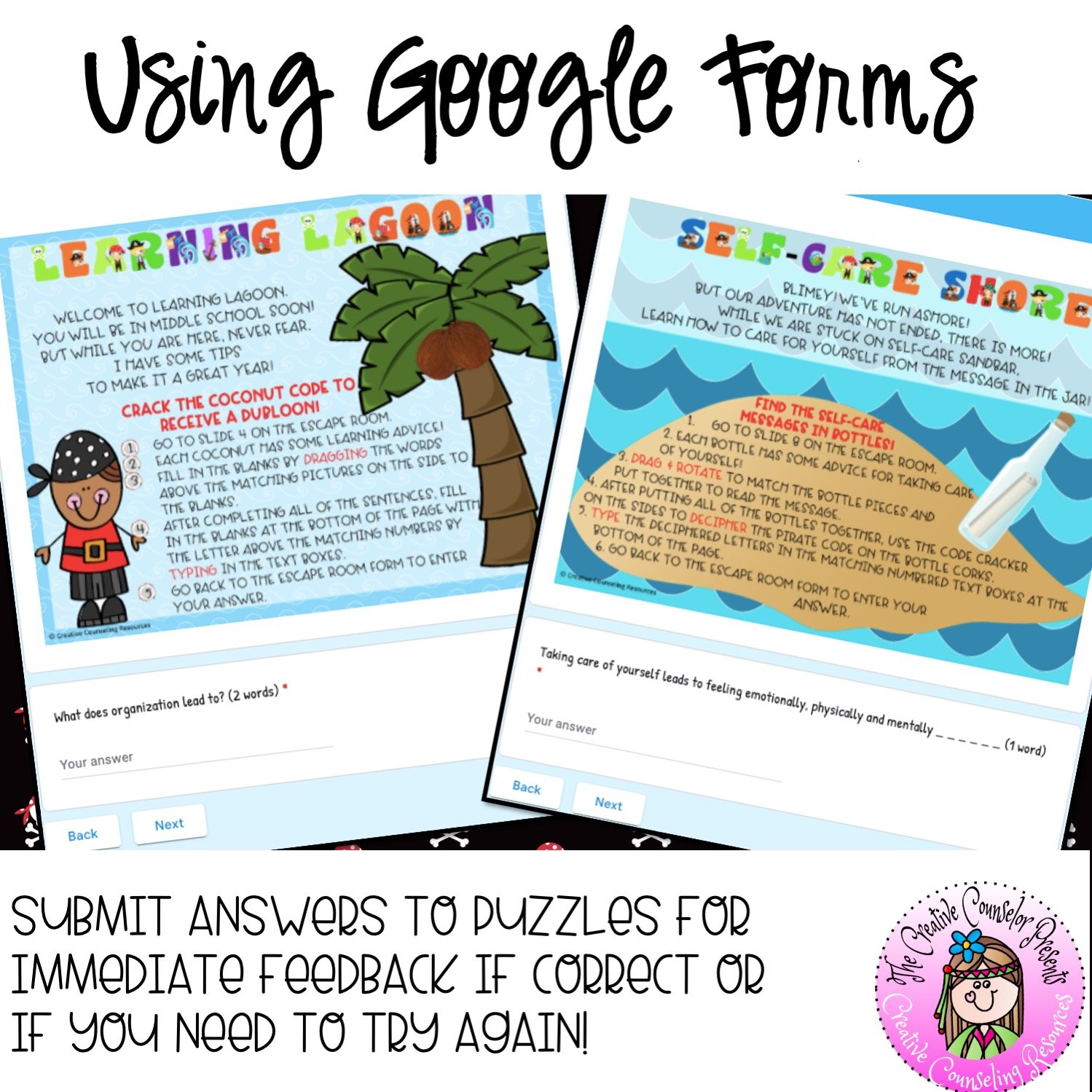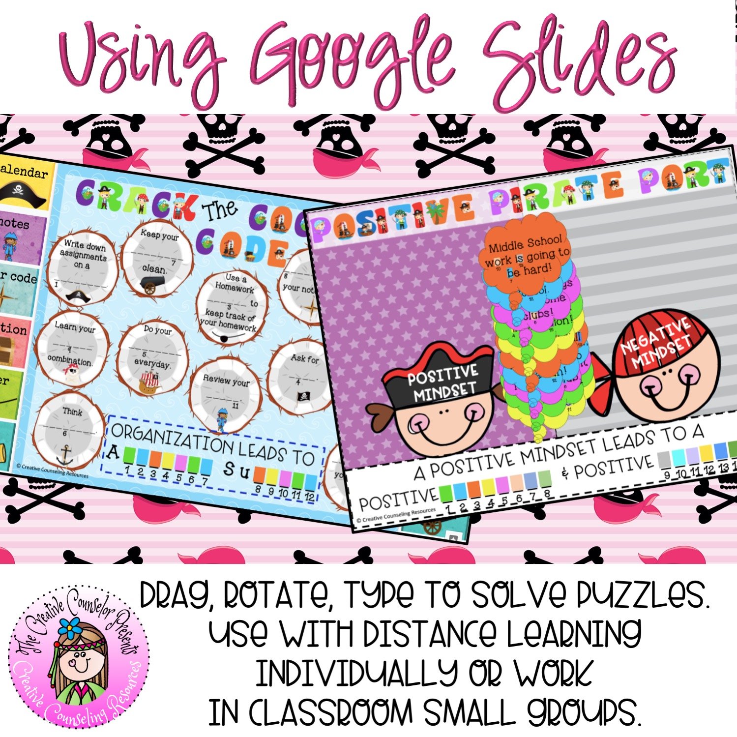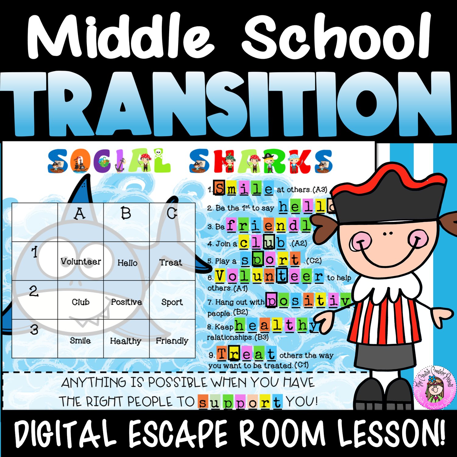 Ahoy there! Are ye a student worried about starting middle school next year? Fear not! Join me and me crew on this adventure and ye will be ready to tackle anything! We'll start at Learning Lagoon and learn academic success tips. Then we'll navigate through Social Shark waters and learn how to be socially successful. We'll also visit Self-Care Sandbar to learn how to take care of ourselves and avoid stress. Finally, we'll dock at Positive Pirate Port to sort out any negative mindsets. This interactive digital escape room is the perfect way to prepare for middle school and have some fun along the way!