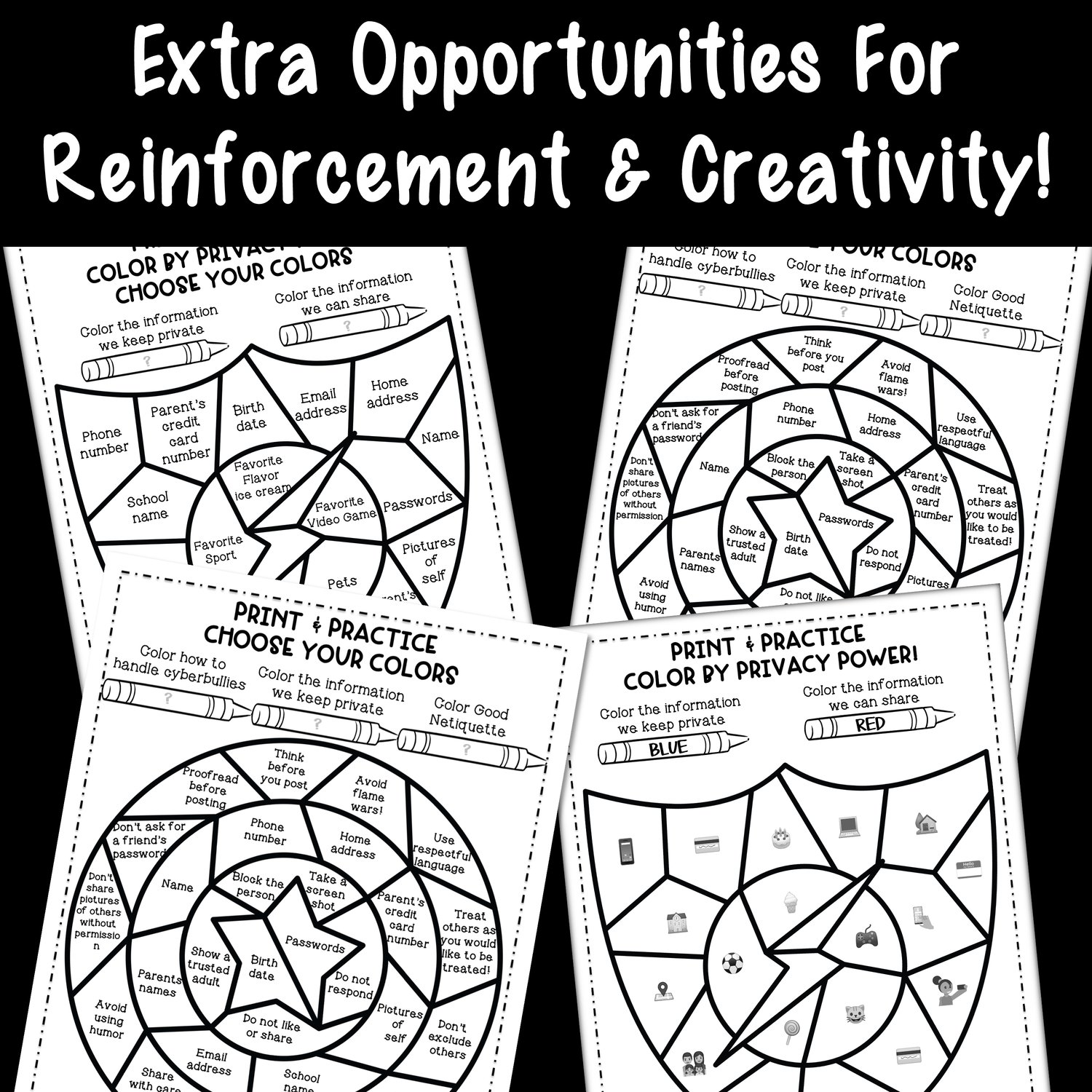 - Print & Go Review: color-by-code activities, reinforcing key concepts of personal, digital safety!