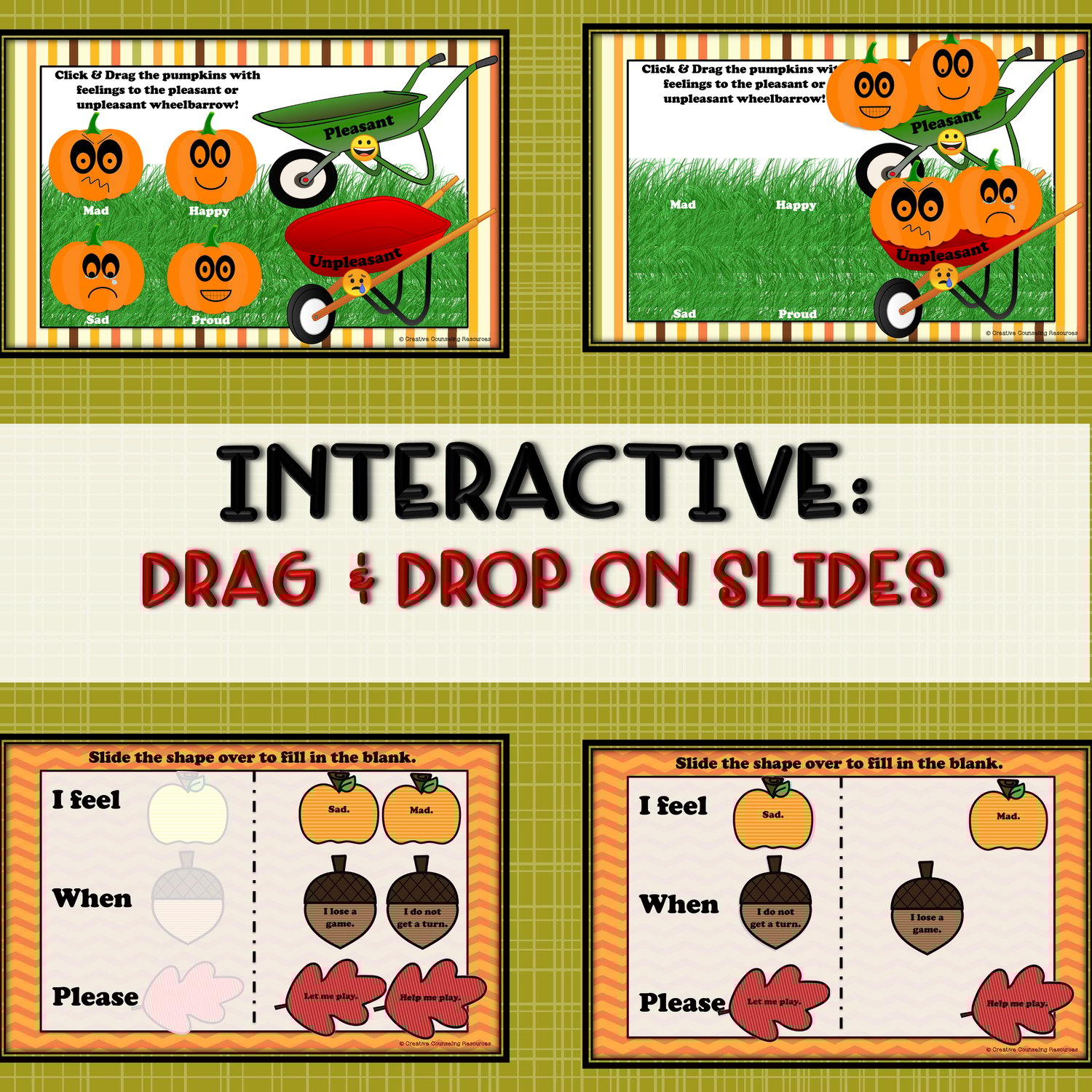 Get ready for fall with this engaging Google Slides lesson offering a variety of interactive activities that promote emotional awareness and effective communication skills! With interactive drag-and-drop activities, this self-directed lesson helps students identify feelings, recognize body language, and practice making "I" statements. Using fun fall-themed elements like a crow hiding behind corn, a Jack O Lantern feelings face, and wheelbarrows for sorting feelings, students will enjoy learning about emotions.