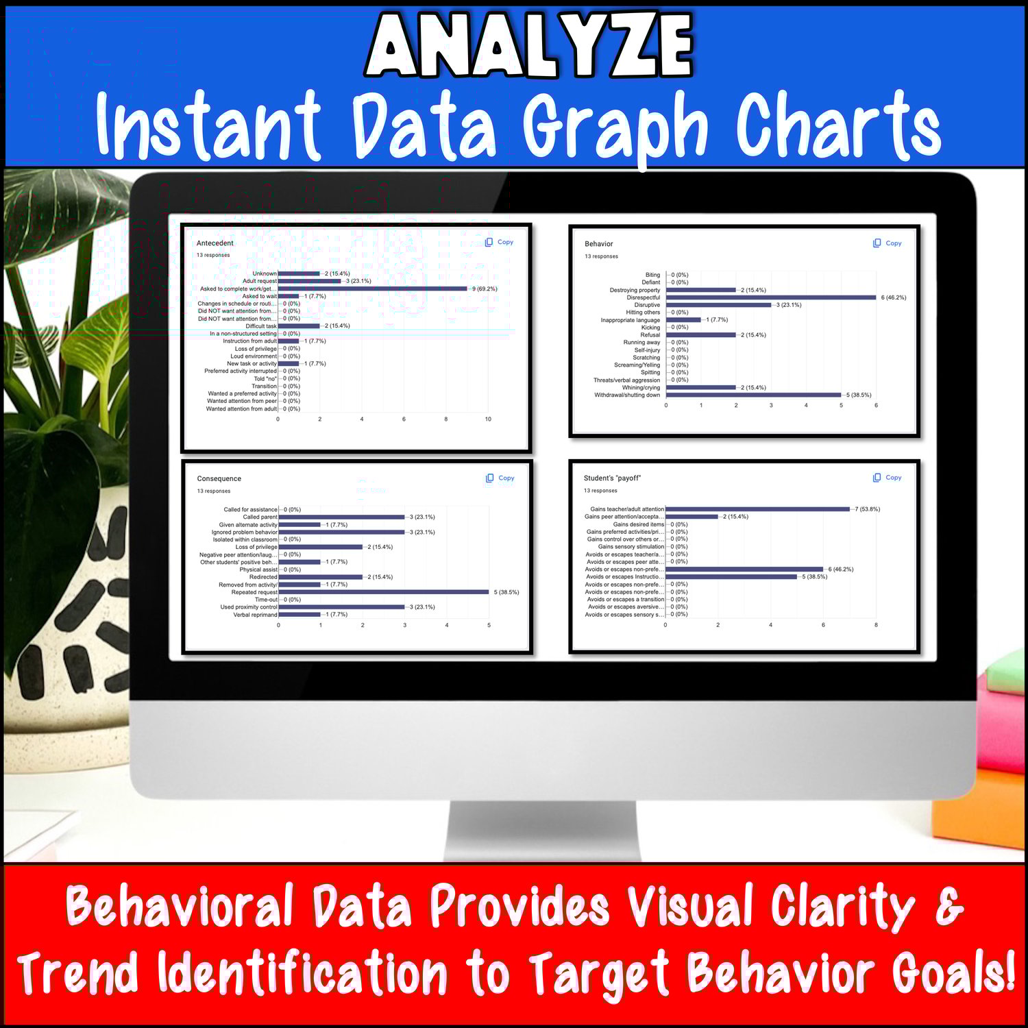 Teachers will have easy access to a tidy online form that they can bookmark for future use. You will have access to a spreadsheet containing all the information and patterns that will help you understand how to support the student. Use the data summary to set specific behavior goals.